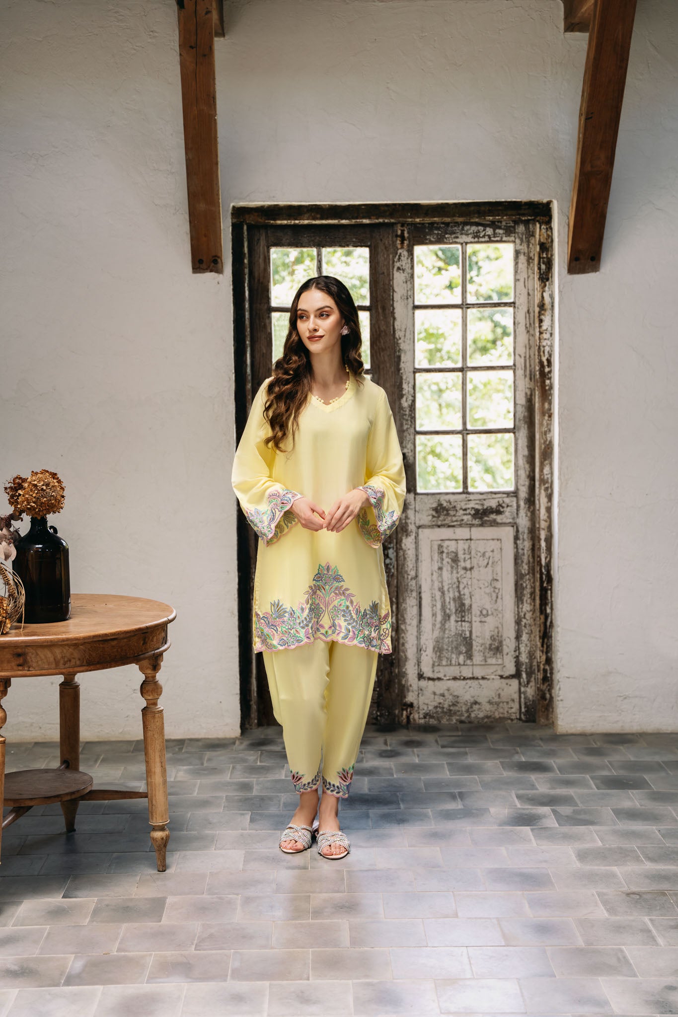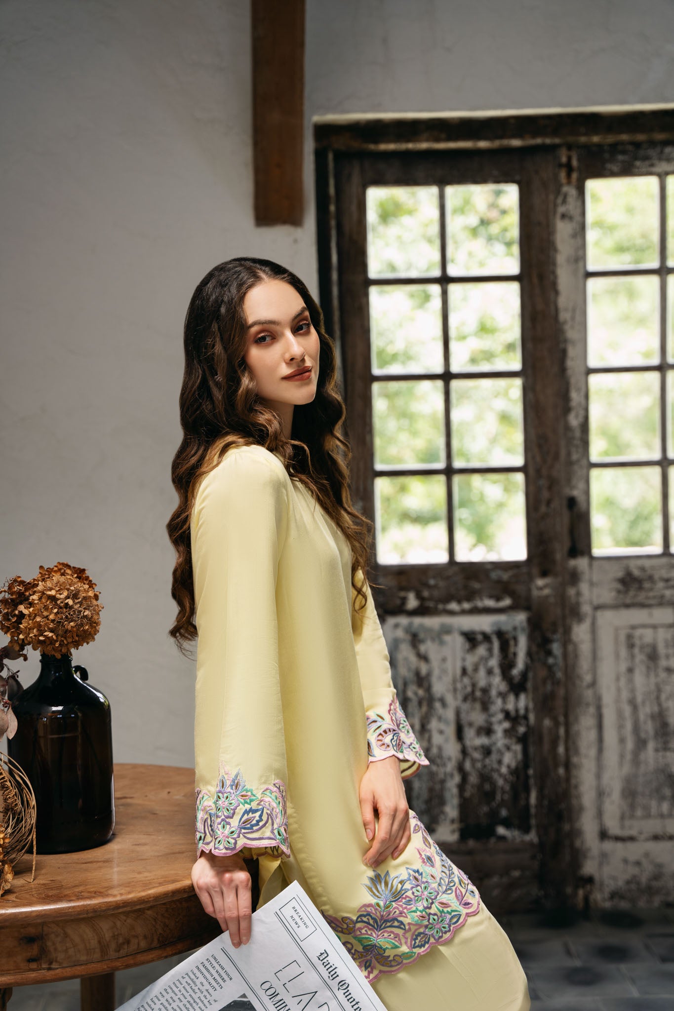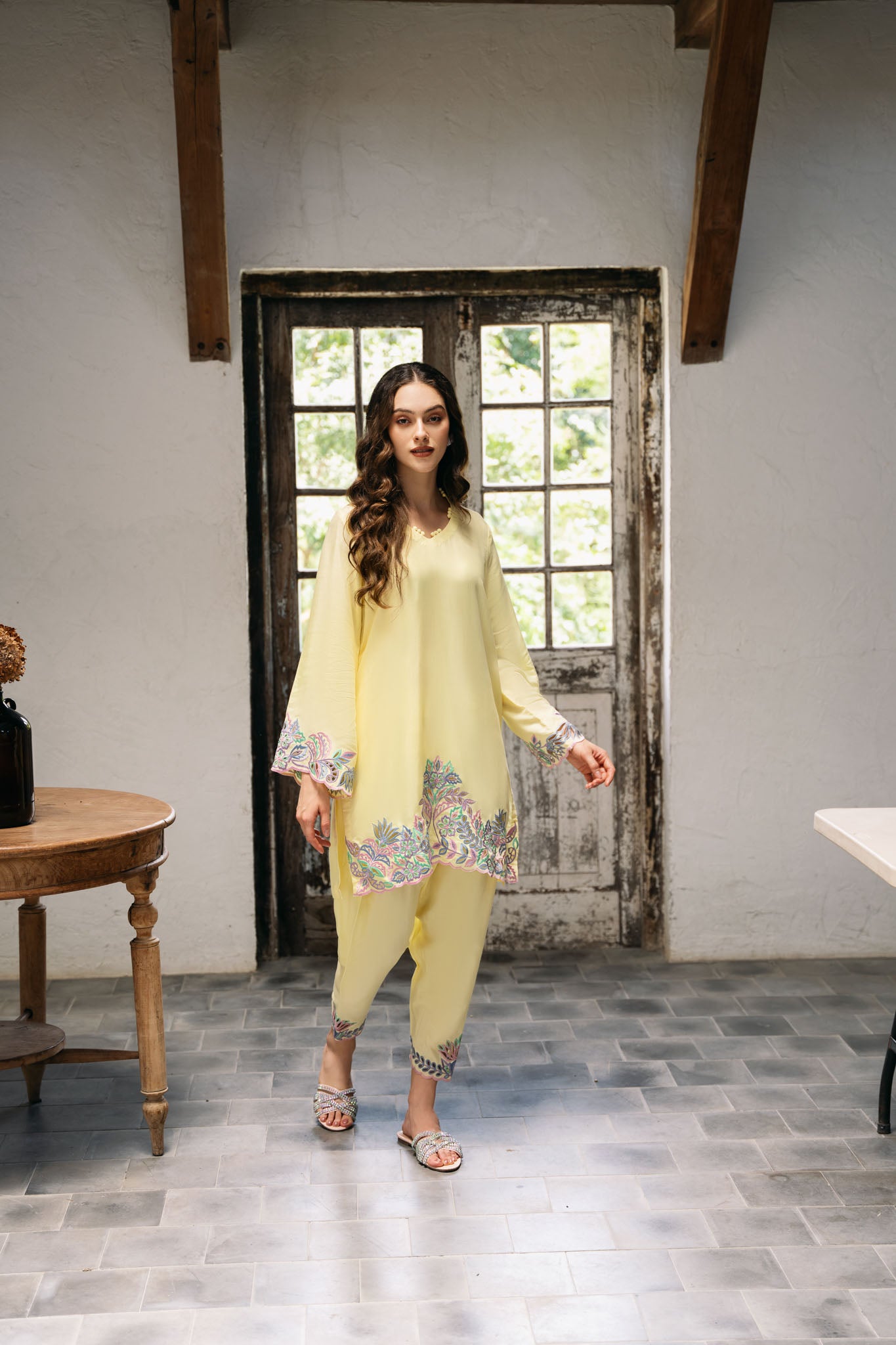 Introducing the Sunshine from our Casuals Collection—a bright and cheerful addition to your wardrobe. This short shirt, paired with a shalwar, features vibrant rainbow embroidery and delicate cutwork, making it the ultimate choice for a lively and fresh look this season.