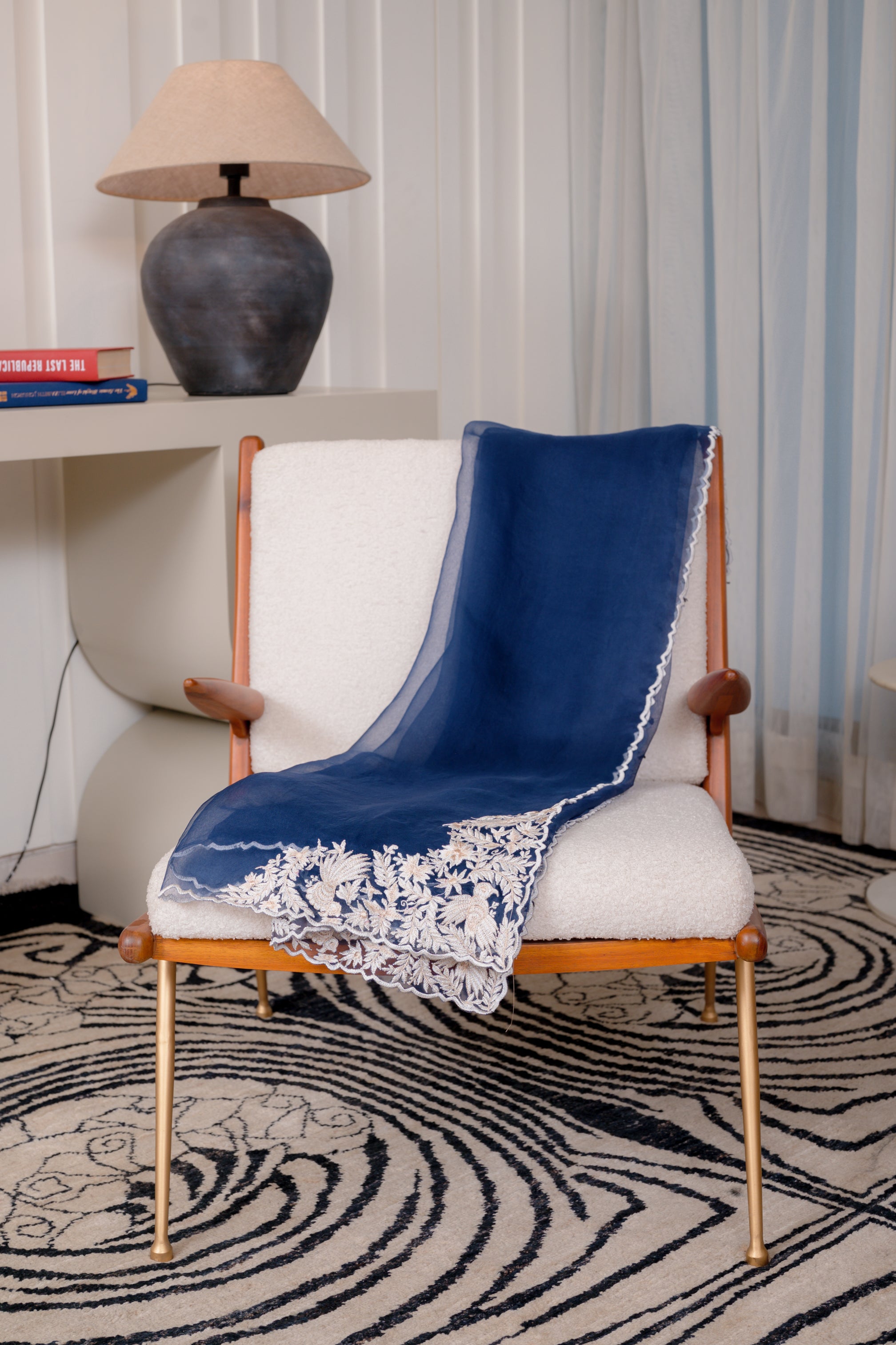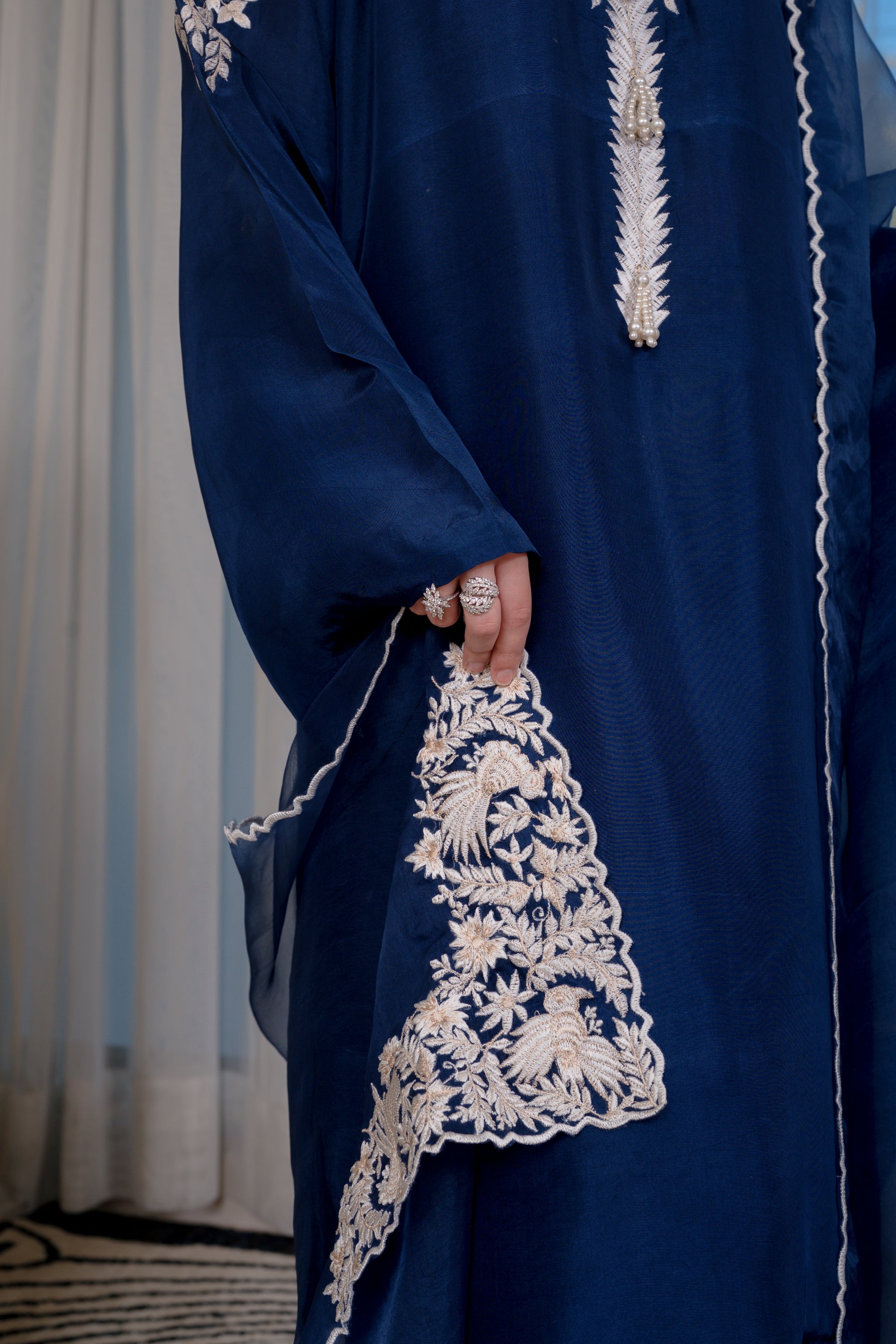 Midnight Charm is a navy blue silk ensemble features a detailed embroidered neckline with pearl accents, while the Korean raw silk culottes showcase organza embroidery and mirror work.