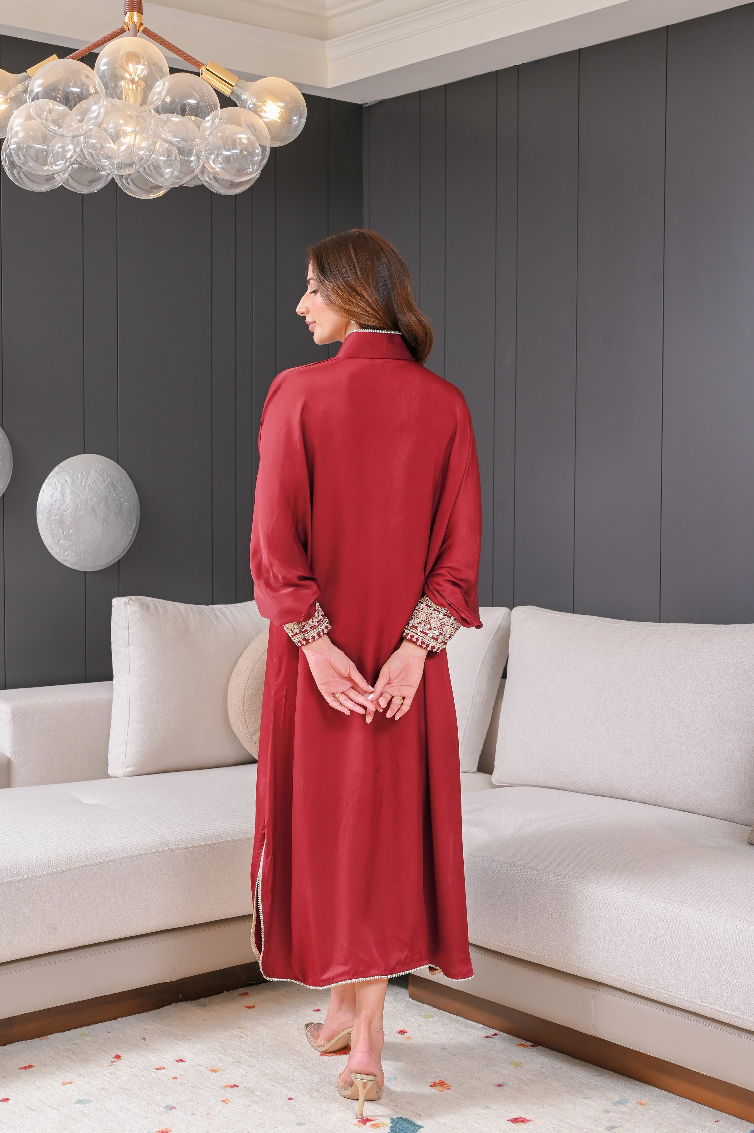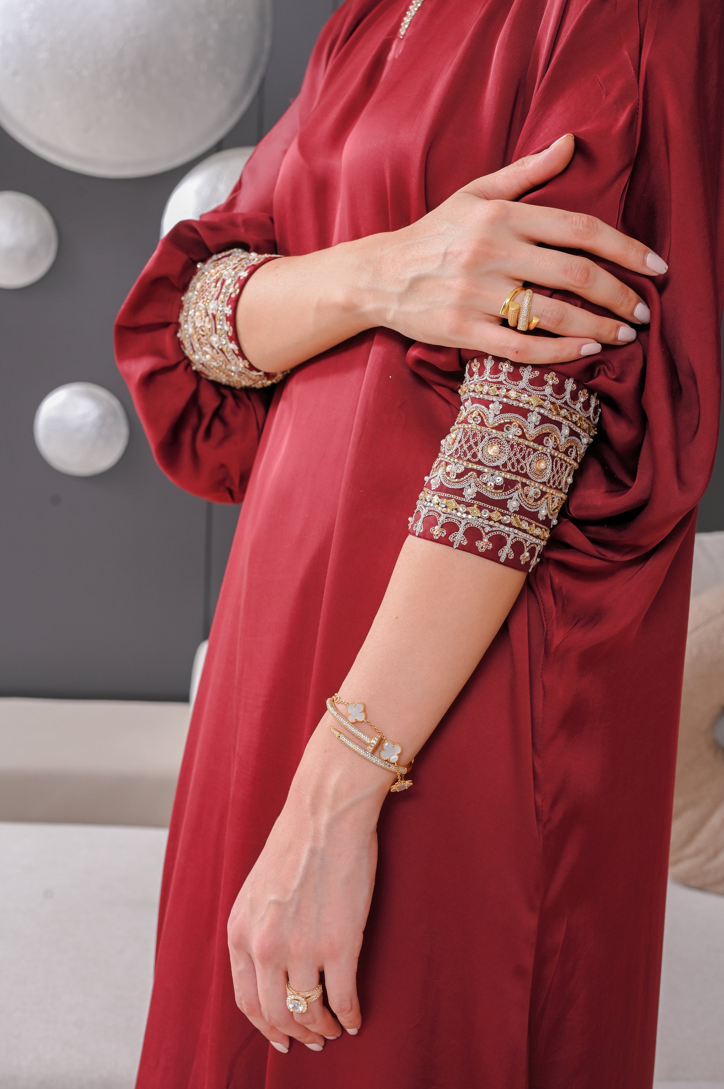 Wine Glow is a stunning two piece pure silk ensemble, intricately adorned with Aari embroidery - enhanced by delicate embellishments of Gota and Zardozi, adding a touch of regal charm.