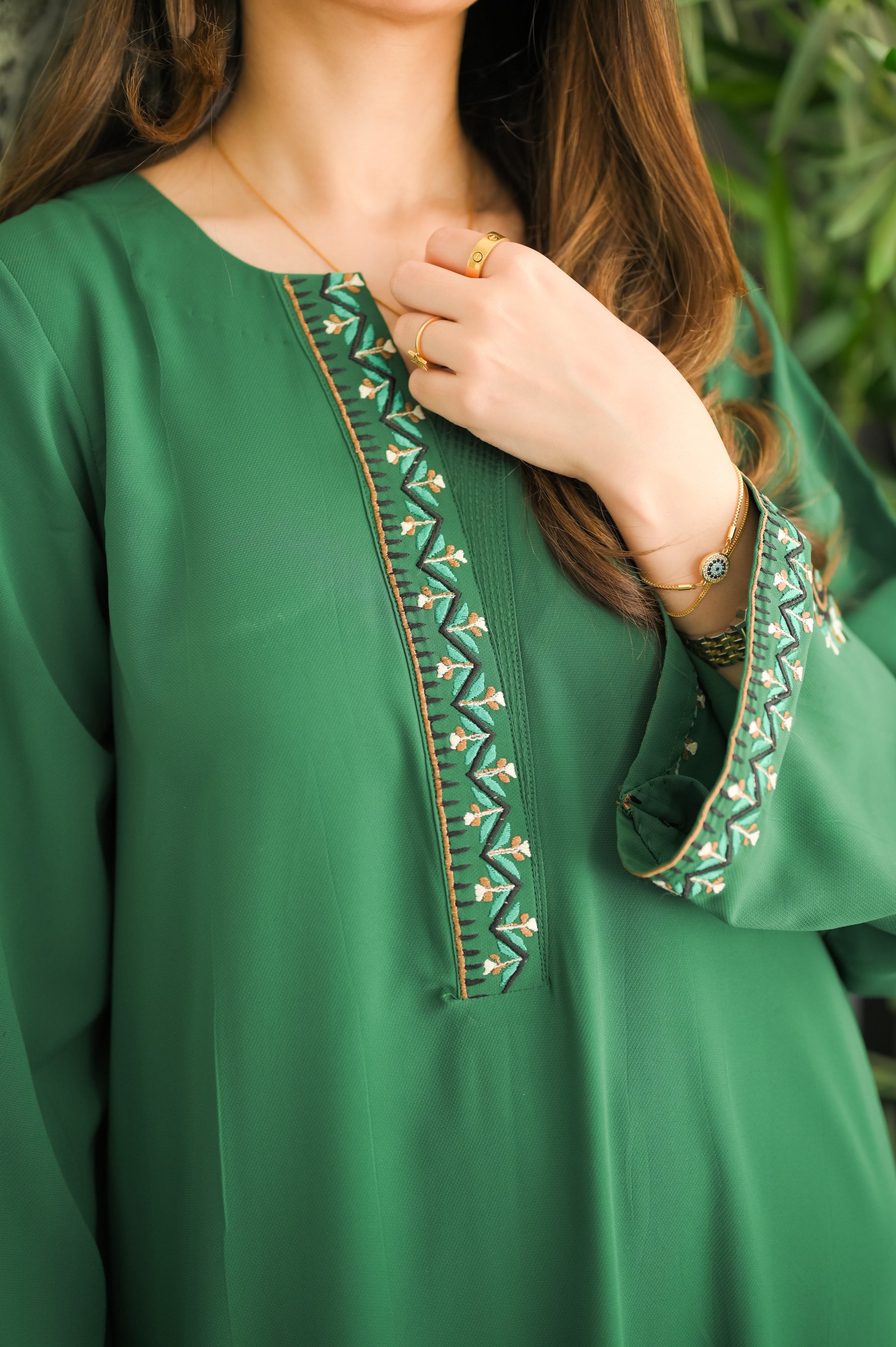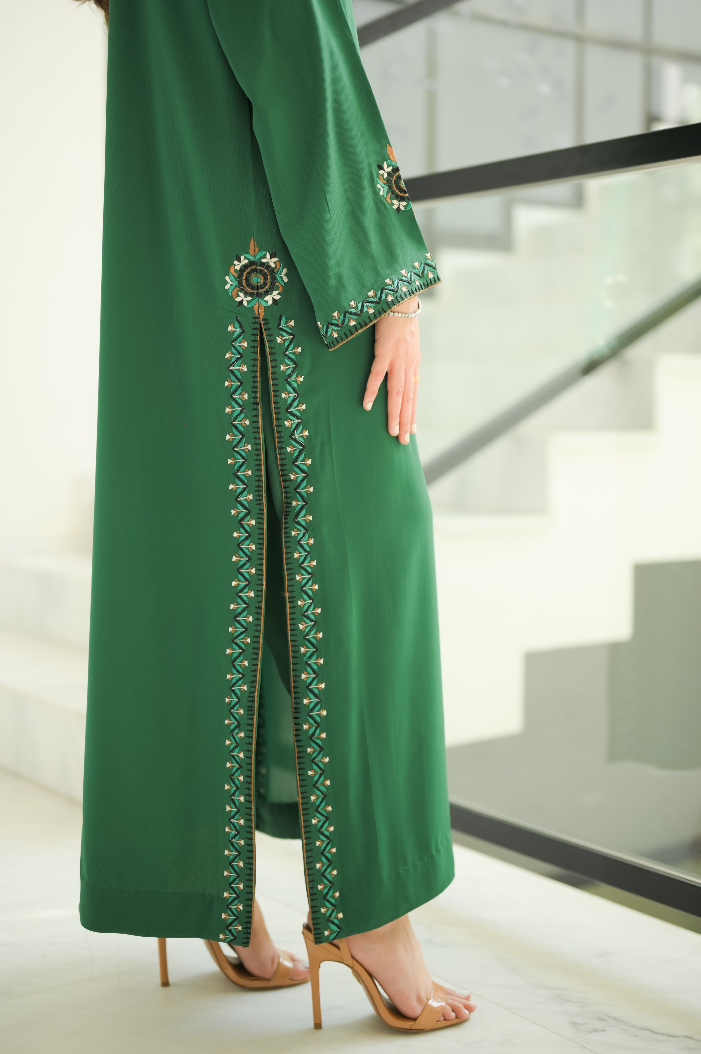 Moss Veil presents a captivating green fabric, enhanced by intricate earthy coloured embroidery that adds depth and vibrancy to the design. The set includes a long, elegant shirt paired with straight-cut pants, offering a perfect harmony of sophistication and comfort.