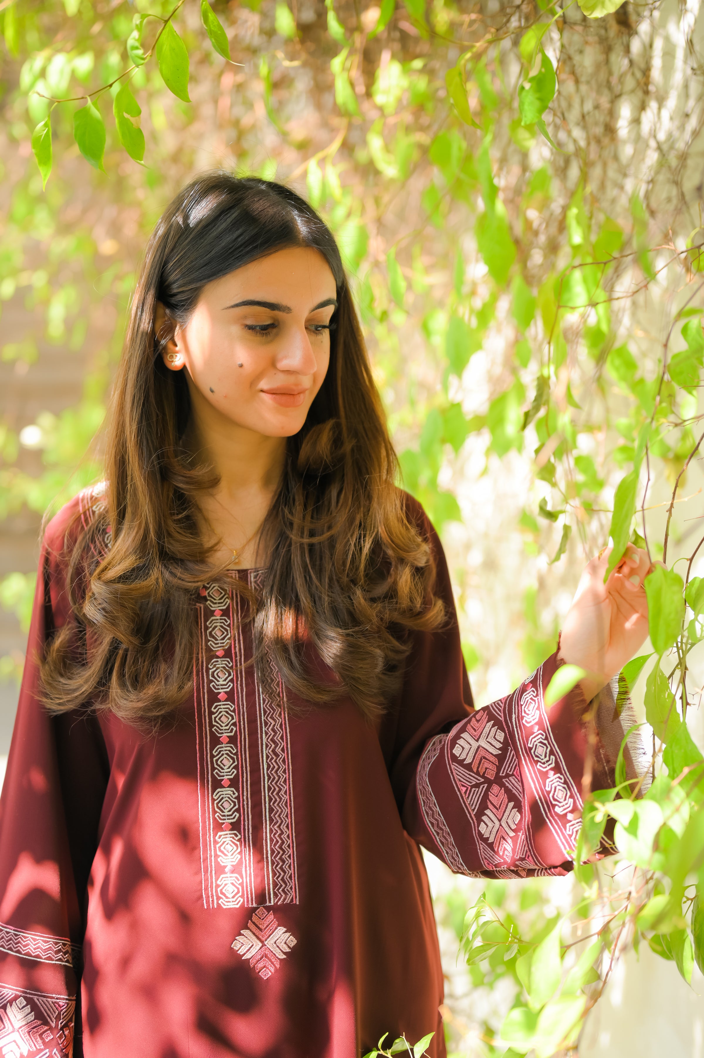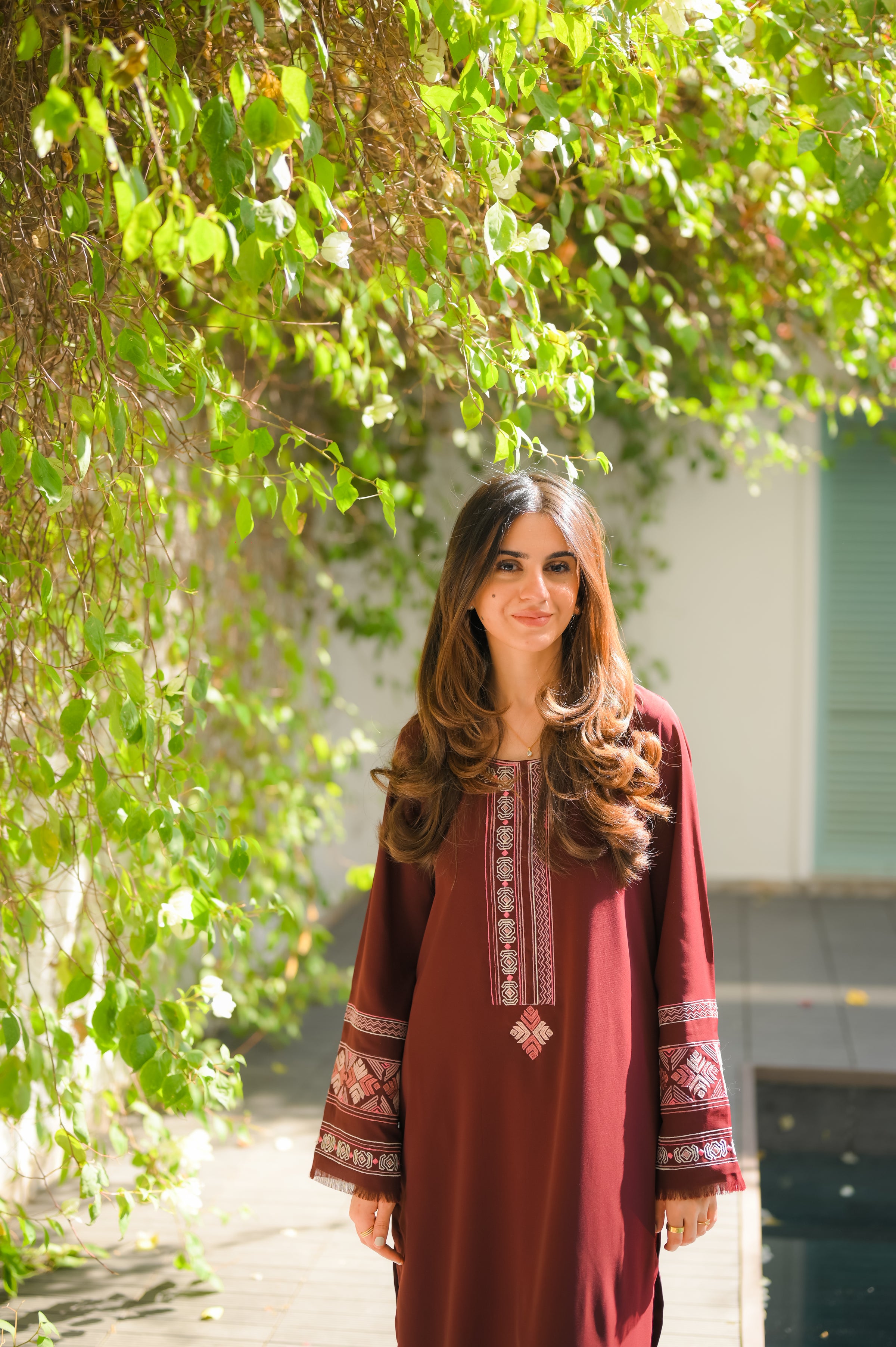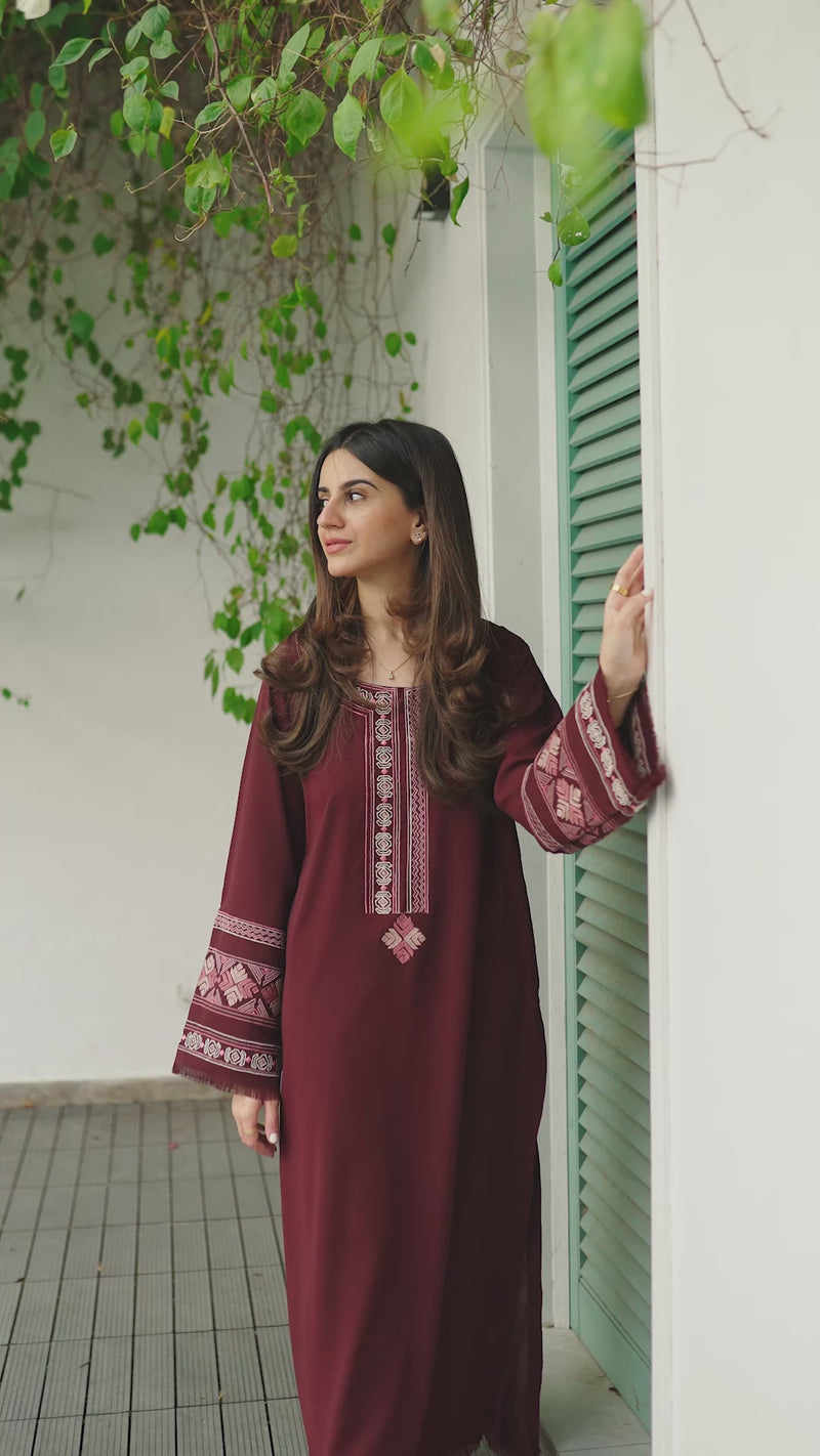 Wine Reverie showcases a burgundy fabric adorned with shades of pink embroidery, creating a stunning contrast that beautifully complements each other. The set includes a long shirt and straight-cut pants, offering a perfect blend of style and comfort.