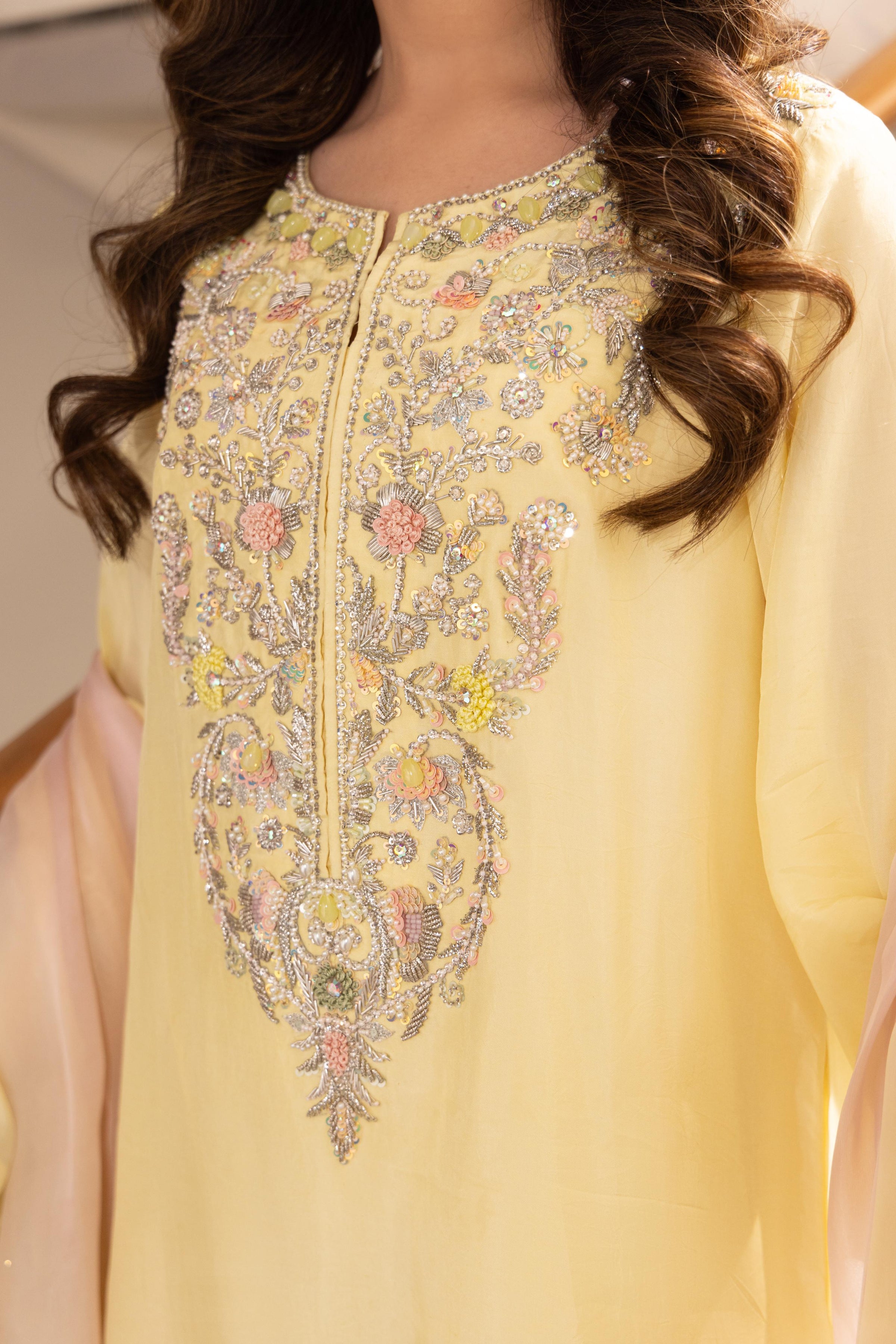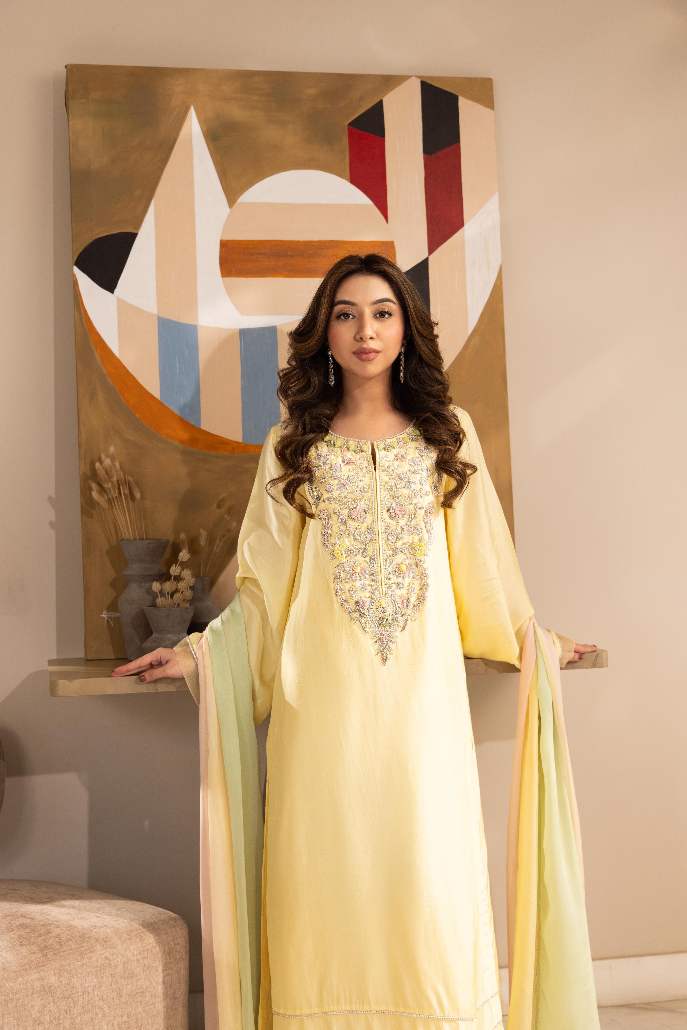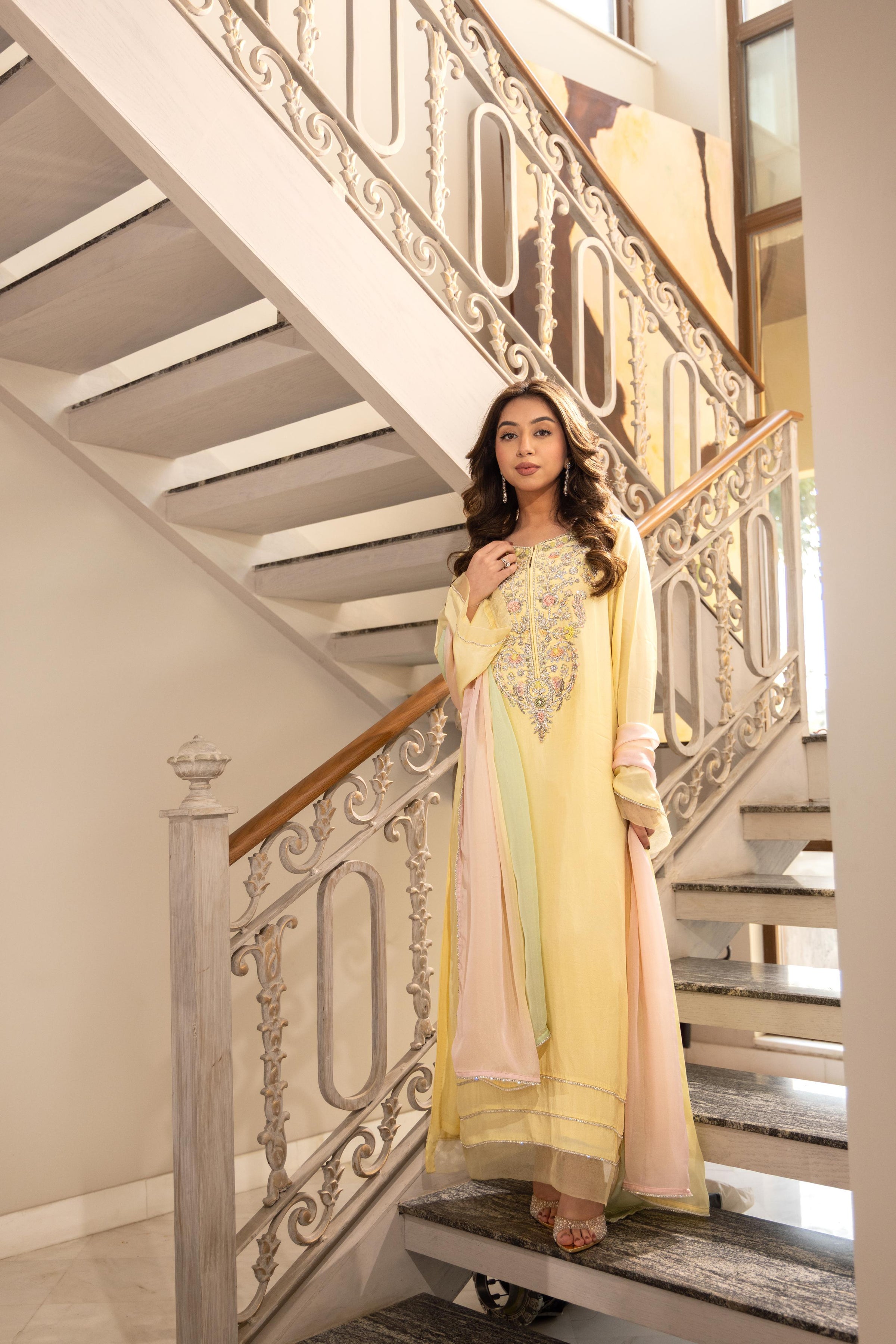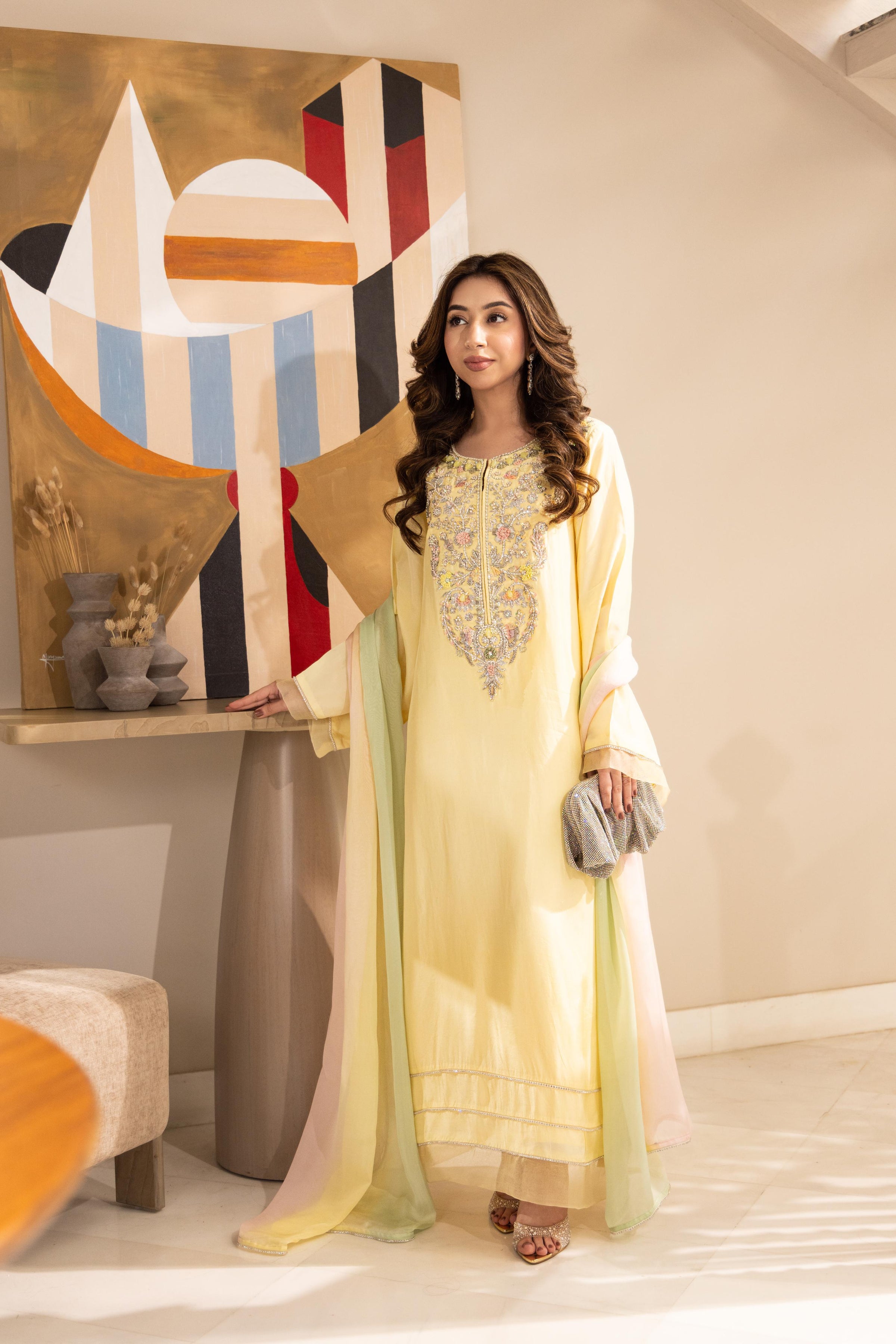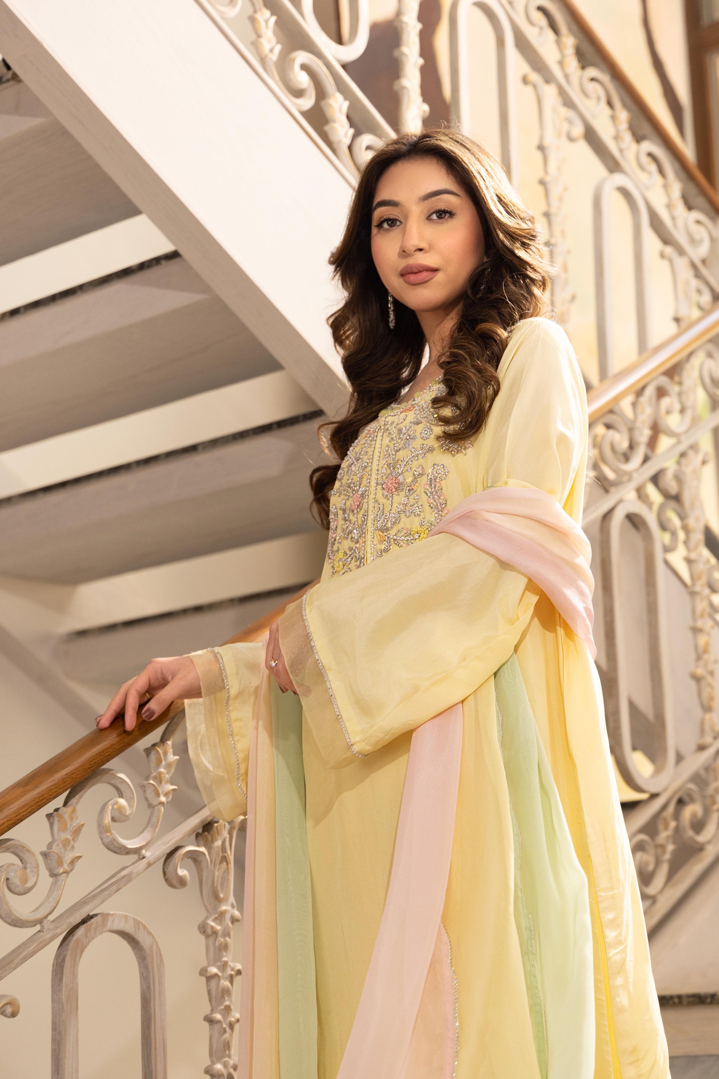 Step into radiant elegance with Butterlight Élan, a delicately crafted soft yellow ensemble designed for refined celebrations. The kameez features intricate pastel and silver embroidery, forming a graceful motif that adds subtle shimmer and depth. Paired with a flowing silhouette finished with fine detailing at the hem. The ensemble is completed with a sheer, pastel-tinted dupatta edged with soft metallic accents.