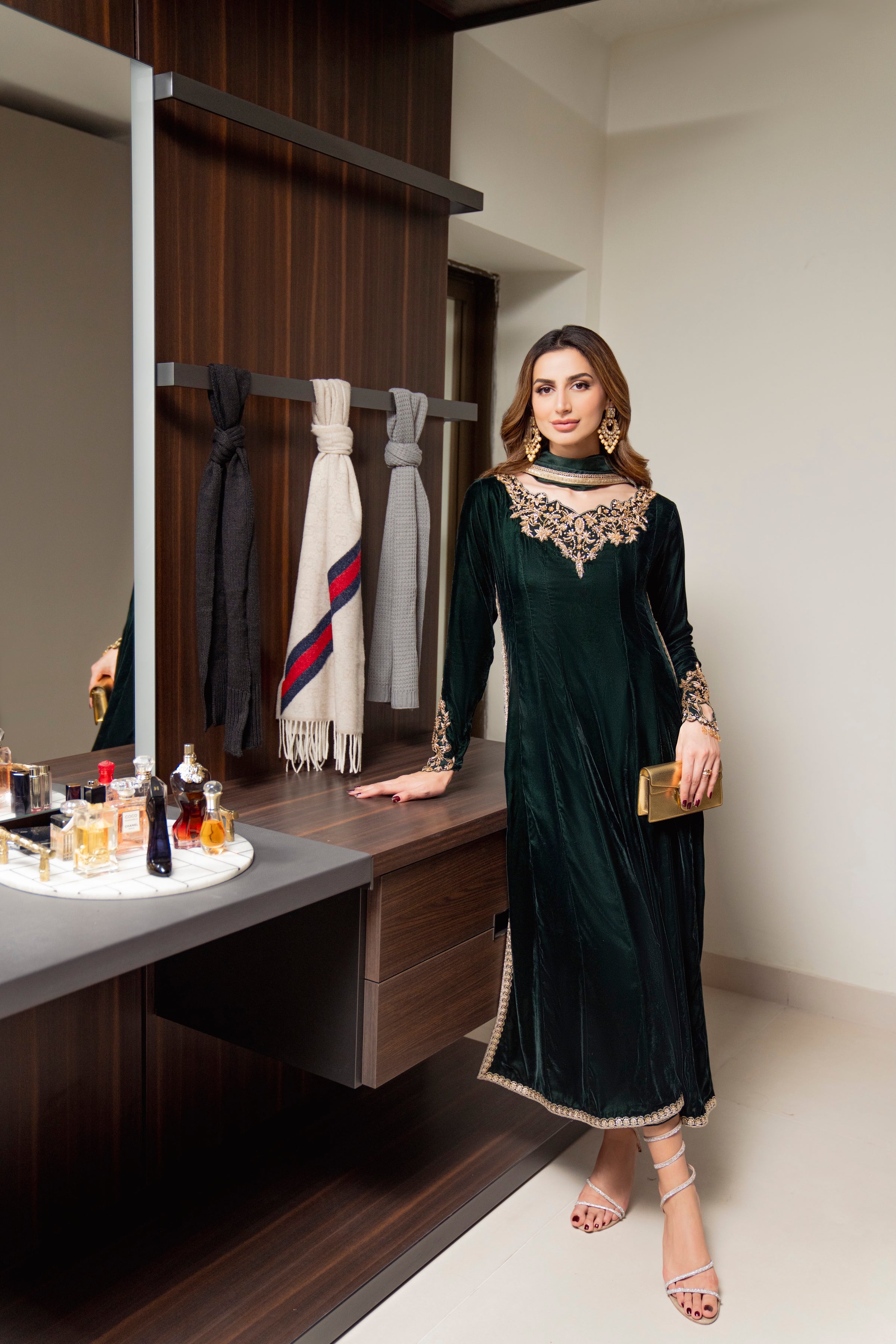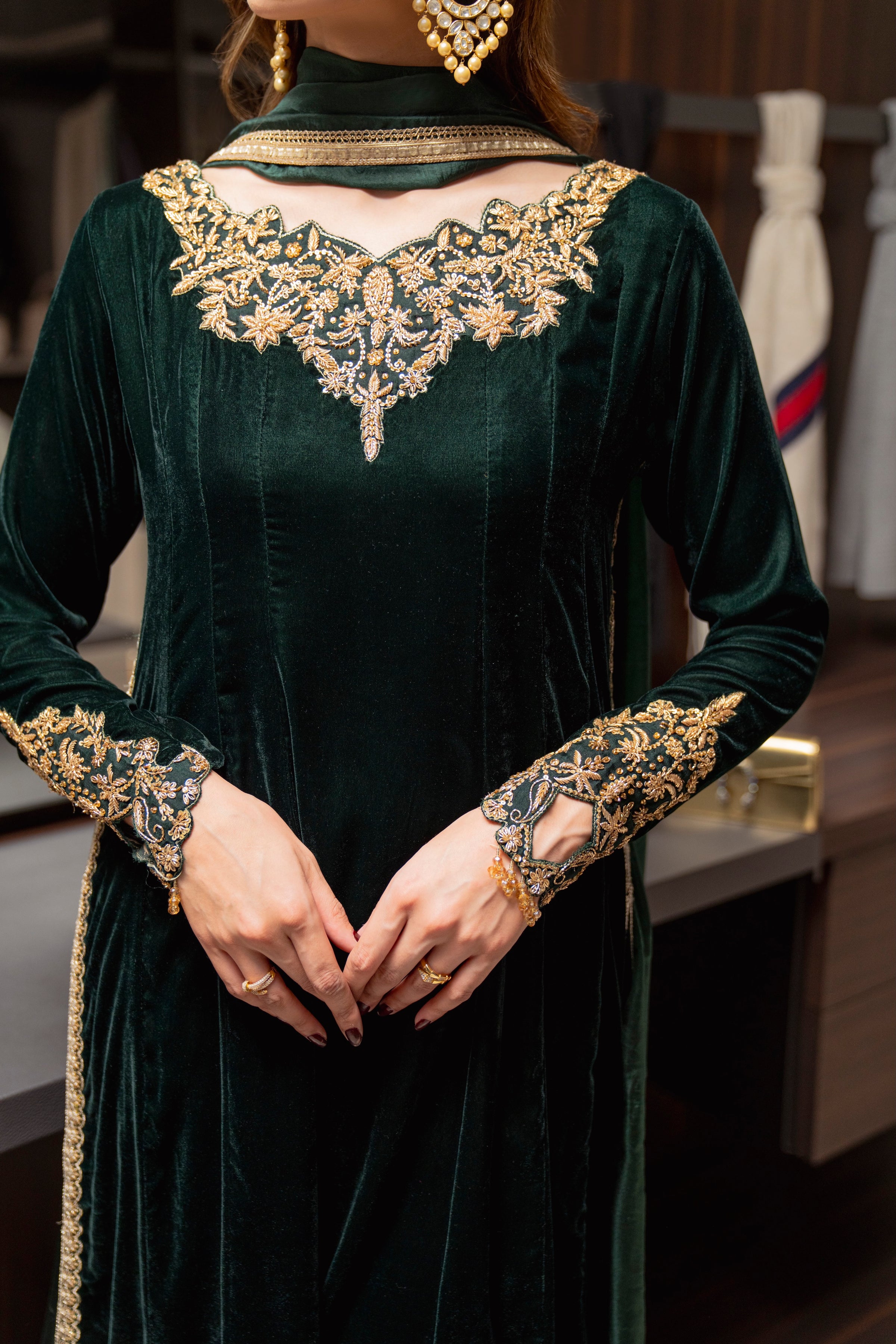 This exquisite emerald green ensemble is a stunning fusion of luxury and craftsmanship. The rich velvet fabric, with its deep dark green hues, is beautifully enhanced by intricate handwork in shimmering gold tones, adding a touch of glamour to your look. The set includes a gracefully embellished dupatta and coordinating trousers, making it a perfect choice for any special occasion.