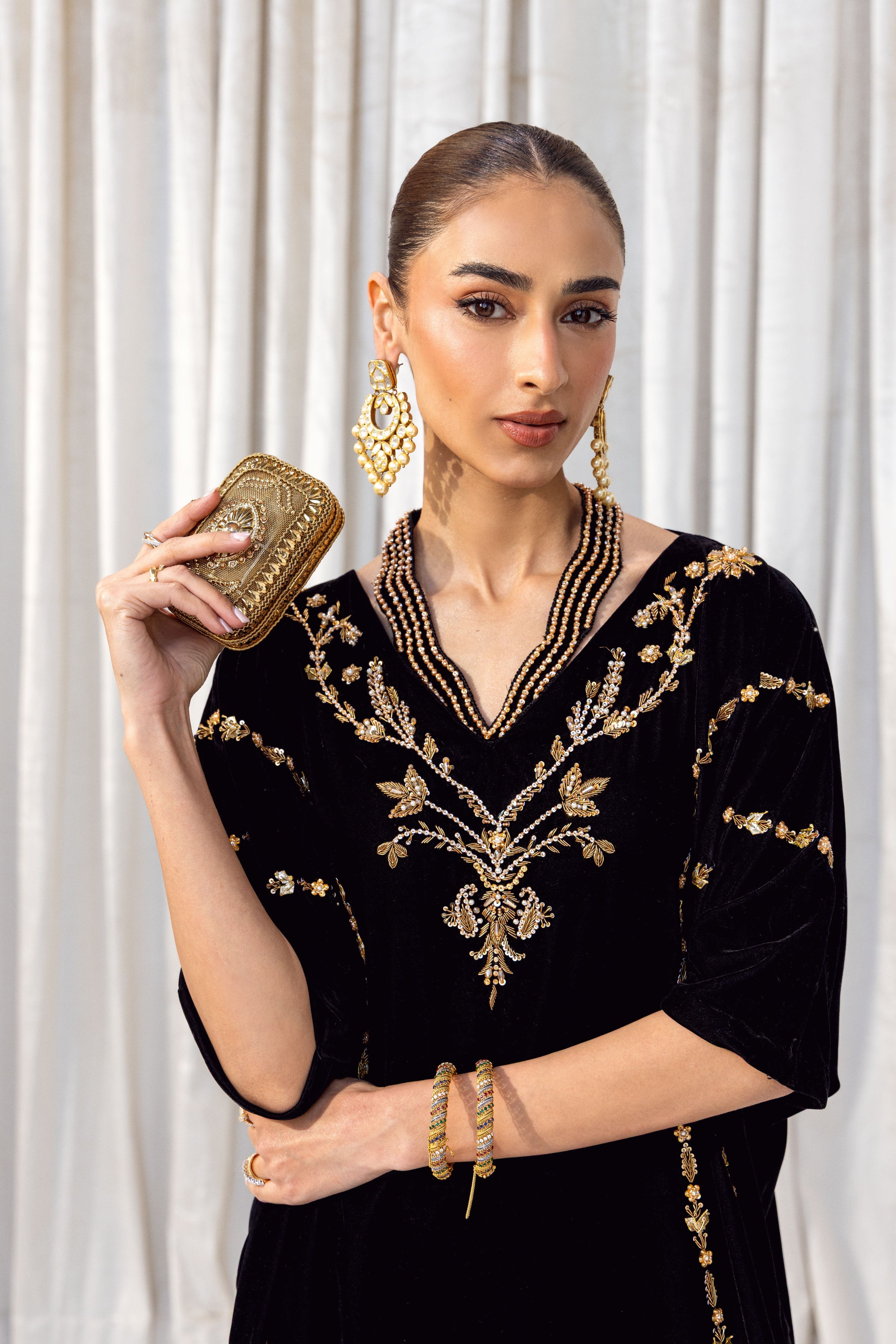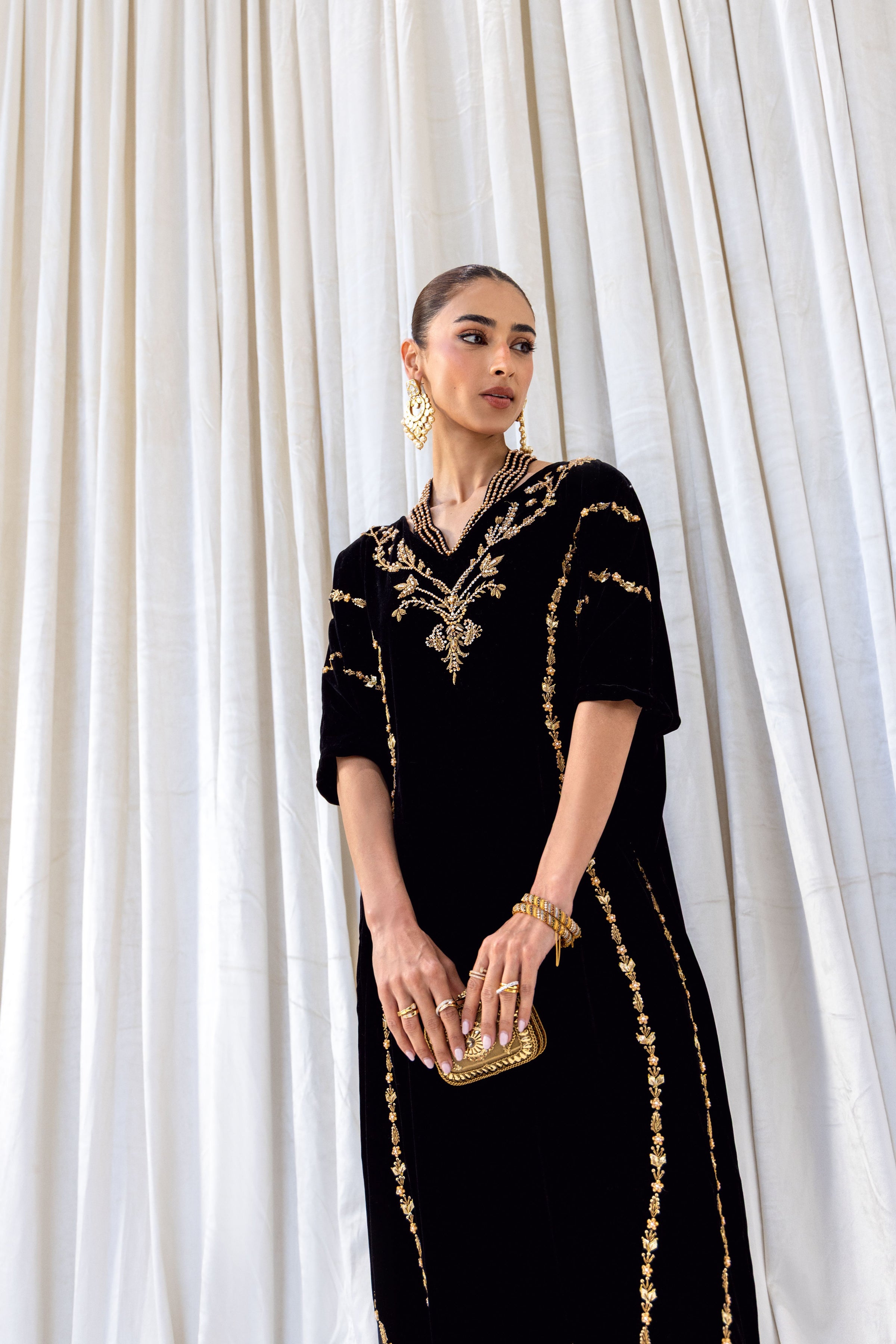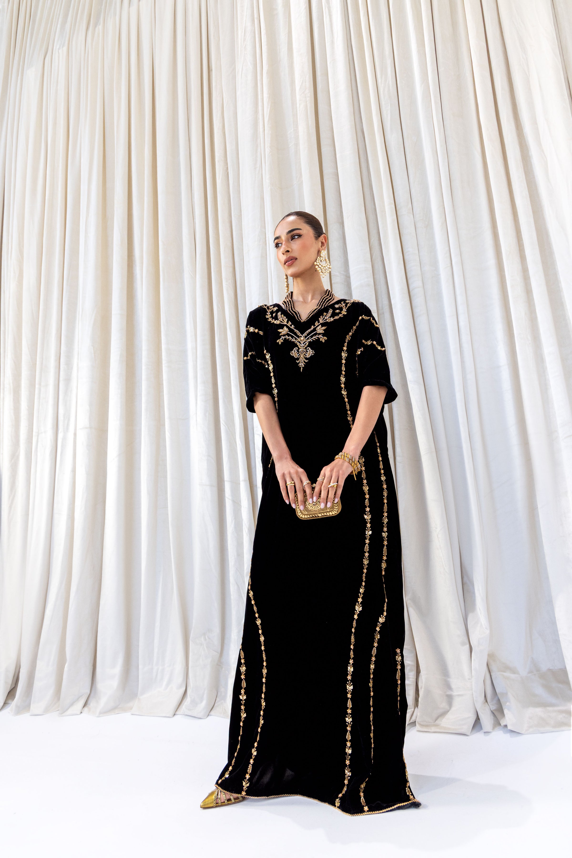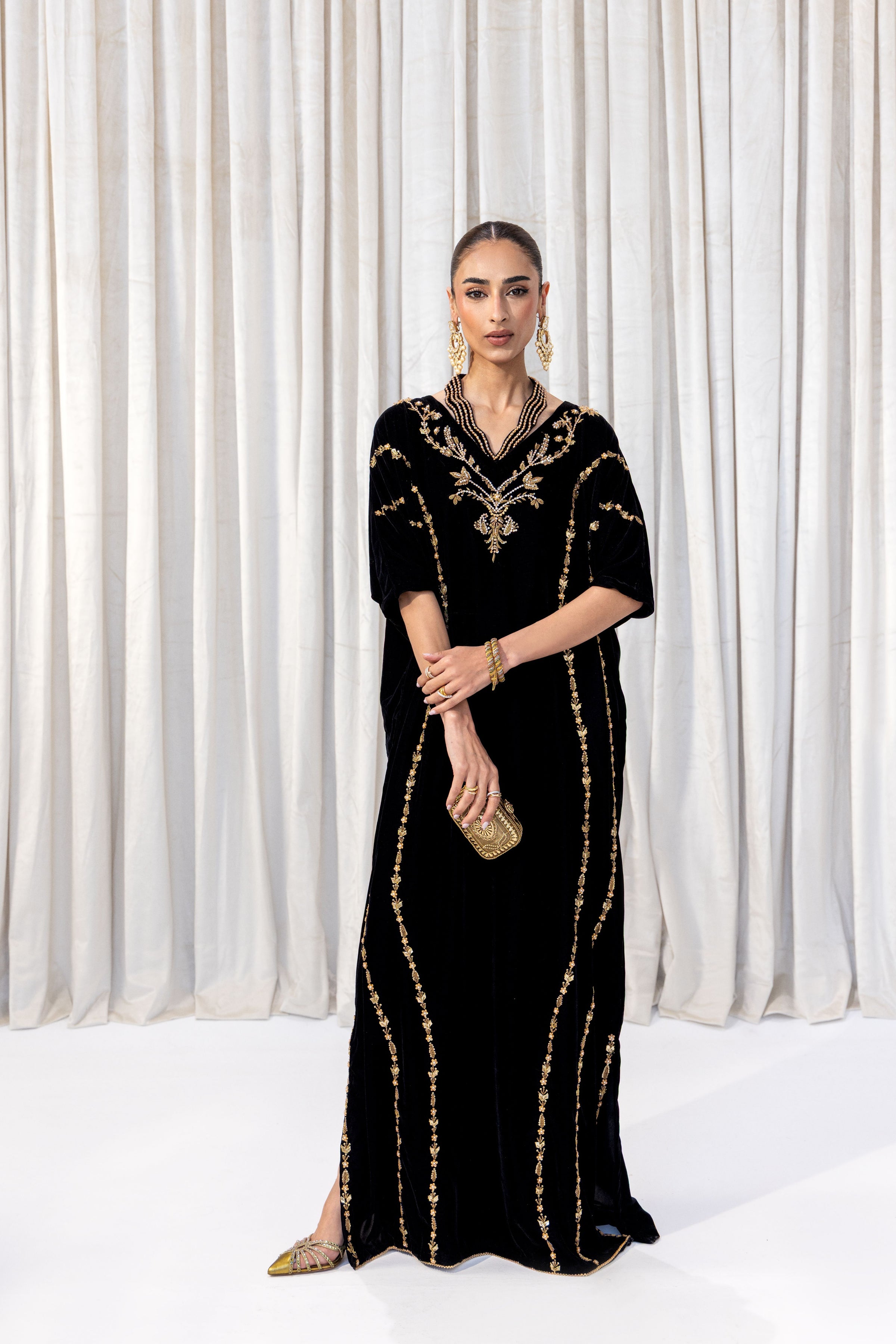 Elevate evening elegance with this luxurious black velvet kaftan, adorned with intricate gold add work that traces the neckline and length of the silhouette. The soft, flowing cut offers effortless sophistication, while the rich embellishment adds a touch of regal charm. This kaftan is perfect for formal gatherings, festive celebrations, and special occasions where timeless glamour is desired.