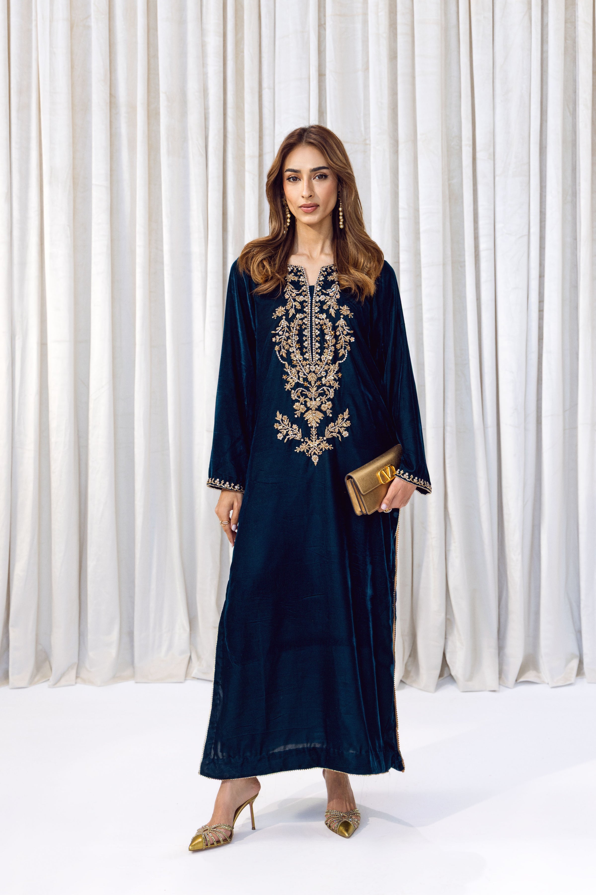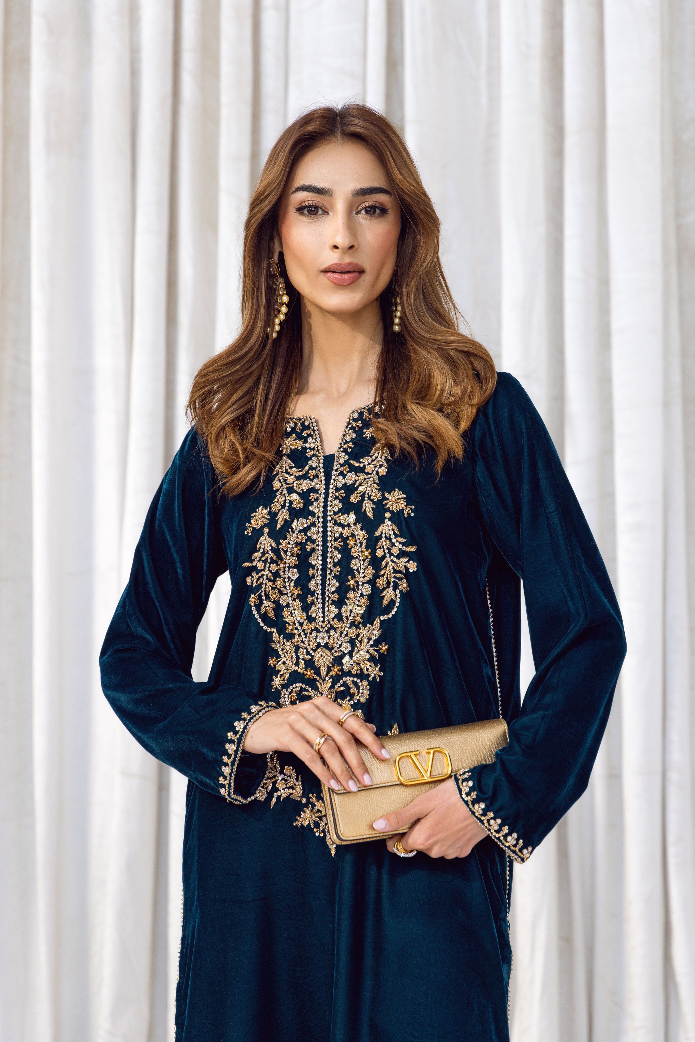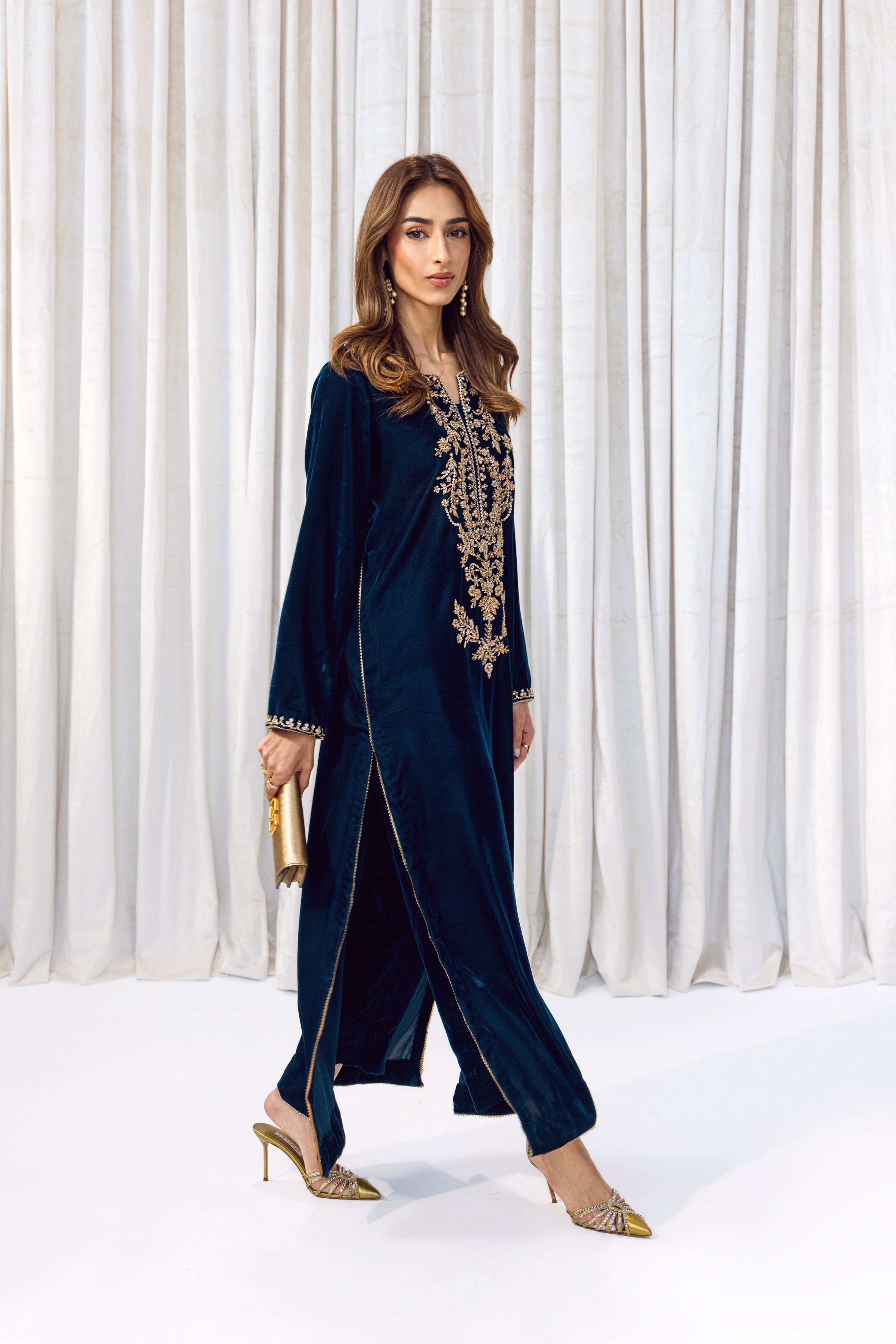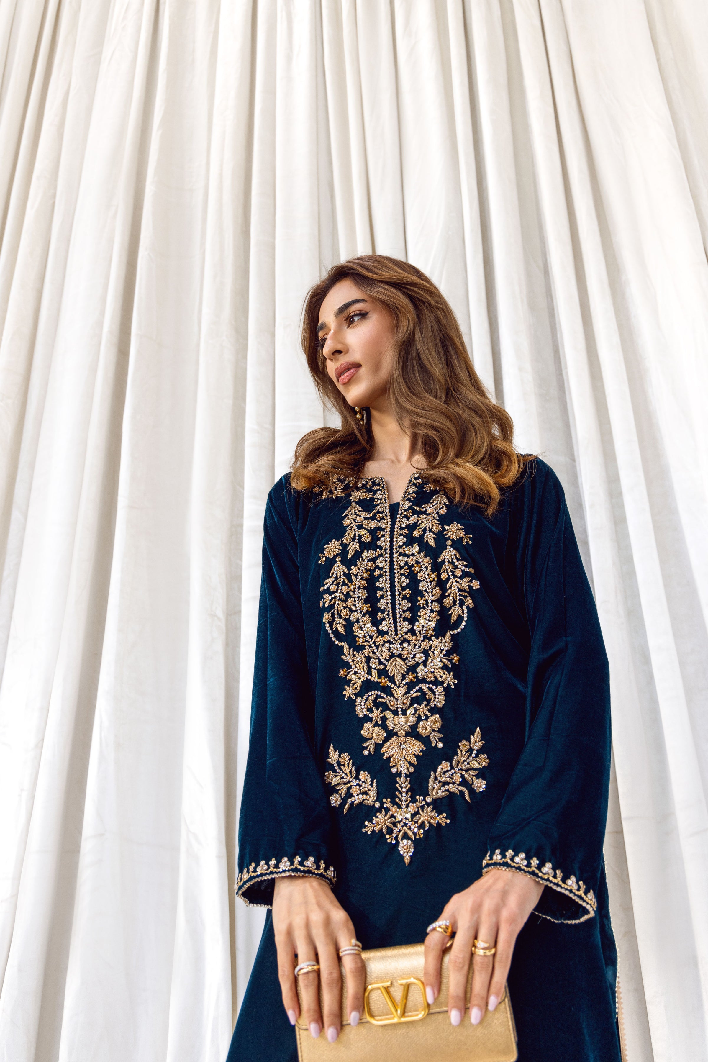 This luxurious midnight-blue velvet shirt features an elegant straight silhouette enriched with intricate gold adda work along the neckline and front. The long sleeves are finished with subtle embellished cuffs, adding refinement to the overall look. Effortless yet glamorous, this set is perfect for evening occasions, festive gatherings, and formal celebrations where comfort meets timeless sophistication.