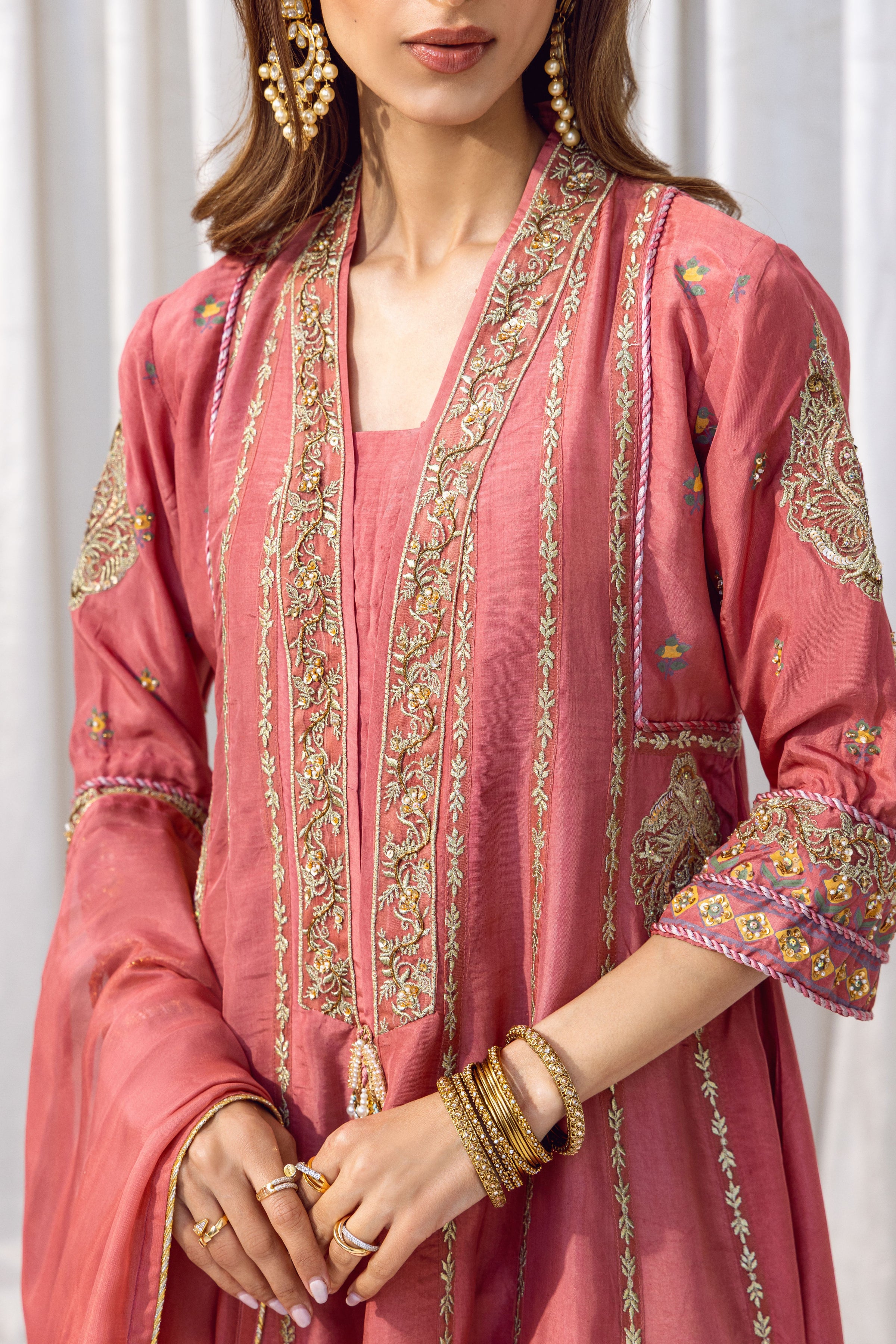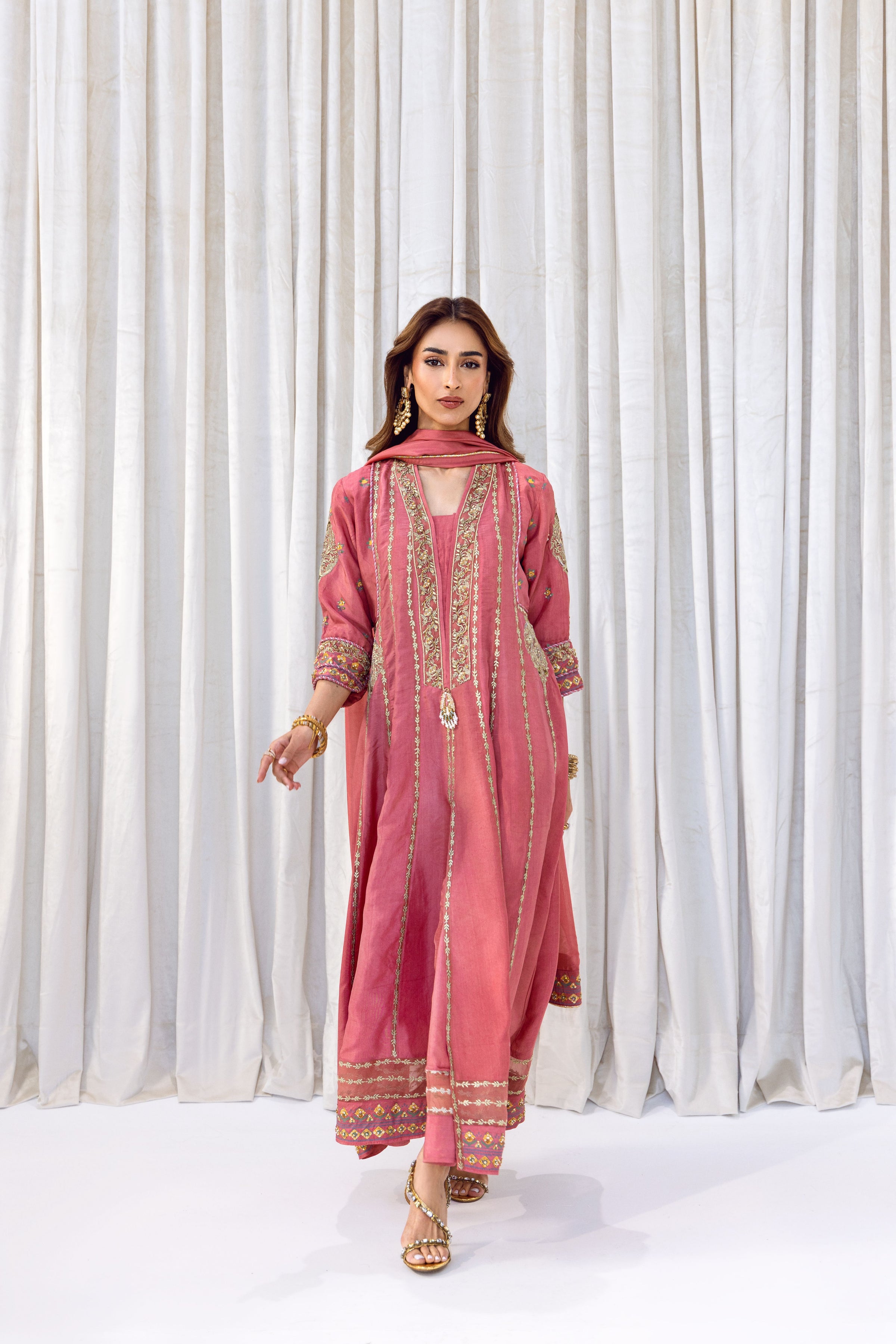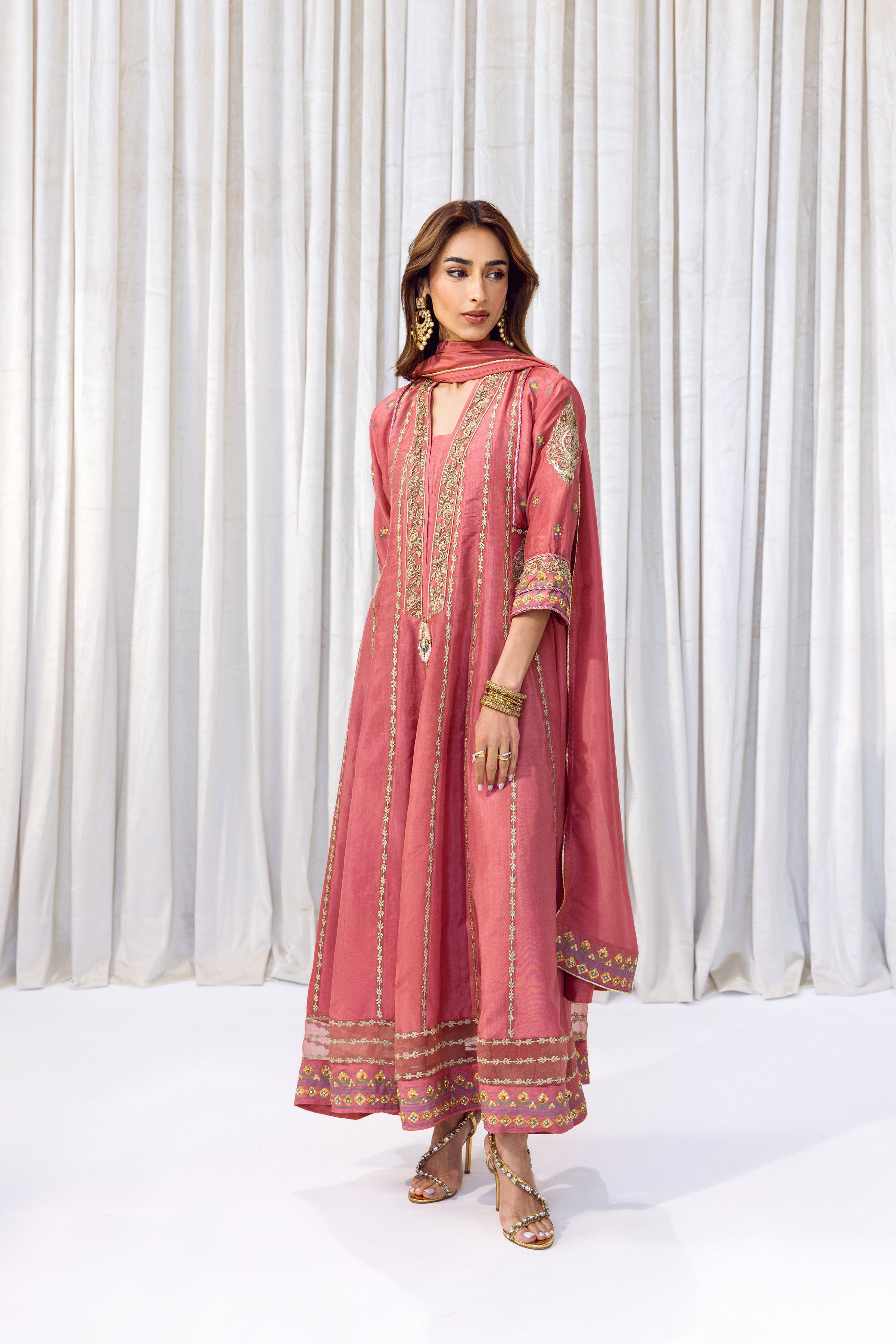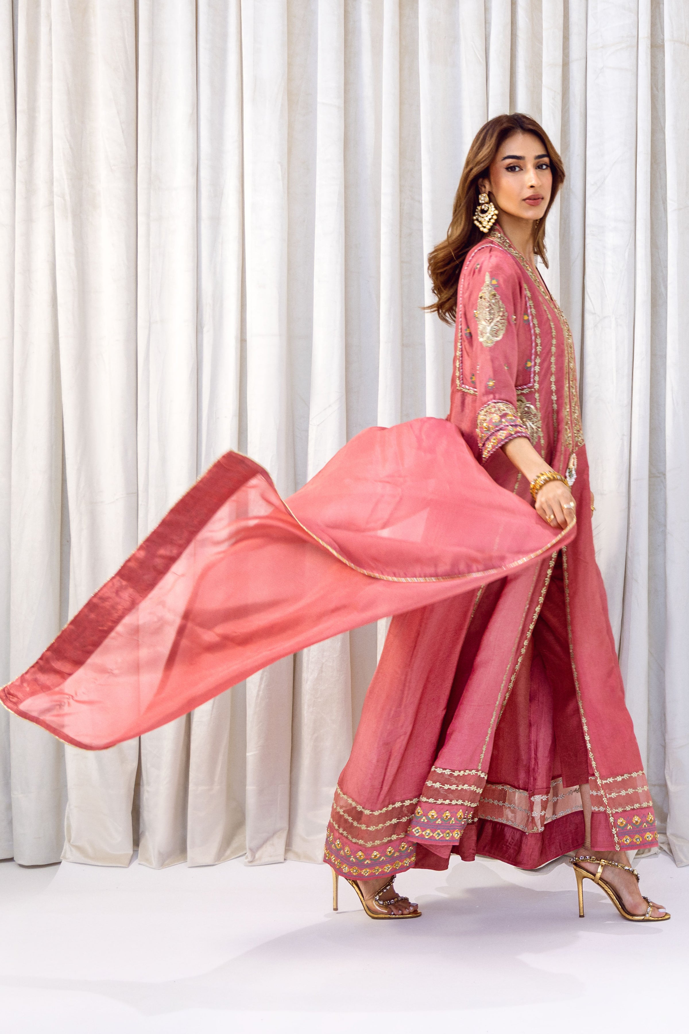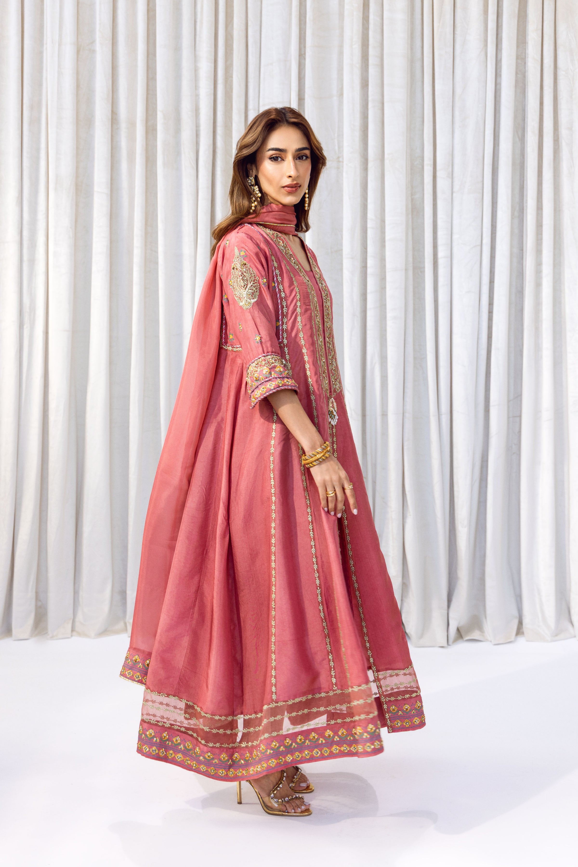 A timeless rose-pink kalidar featuring a flowing silhouette, delicate tilla work and block print, and beautifully finished embleishments. Completed with a matching dupatta and trousers, this set offers effortless grace for any special occasion.