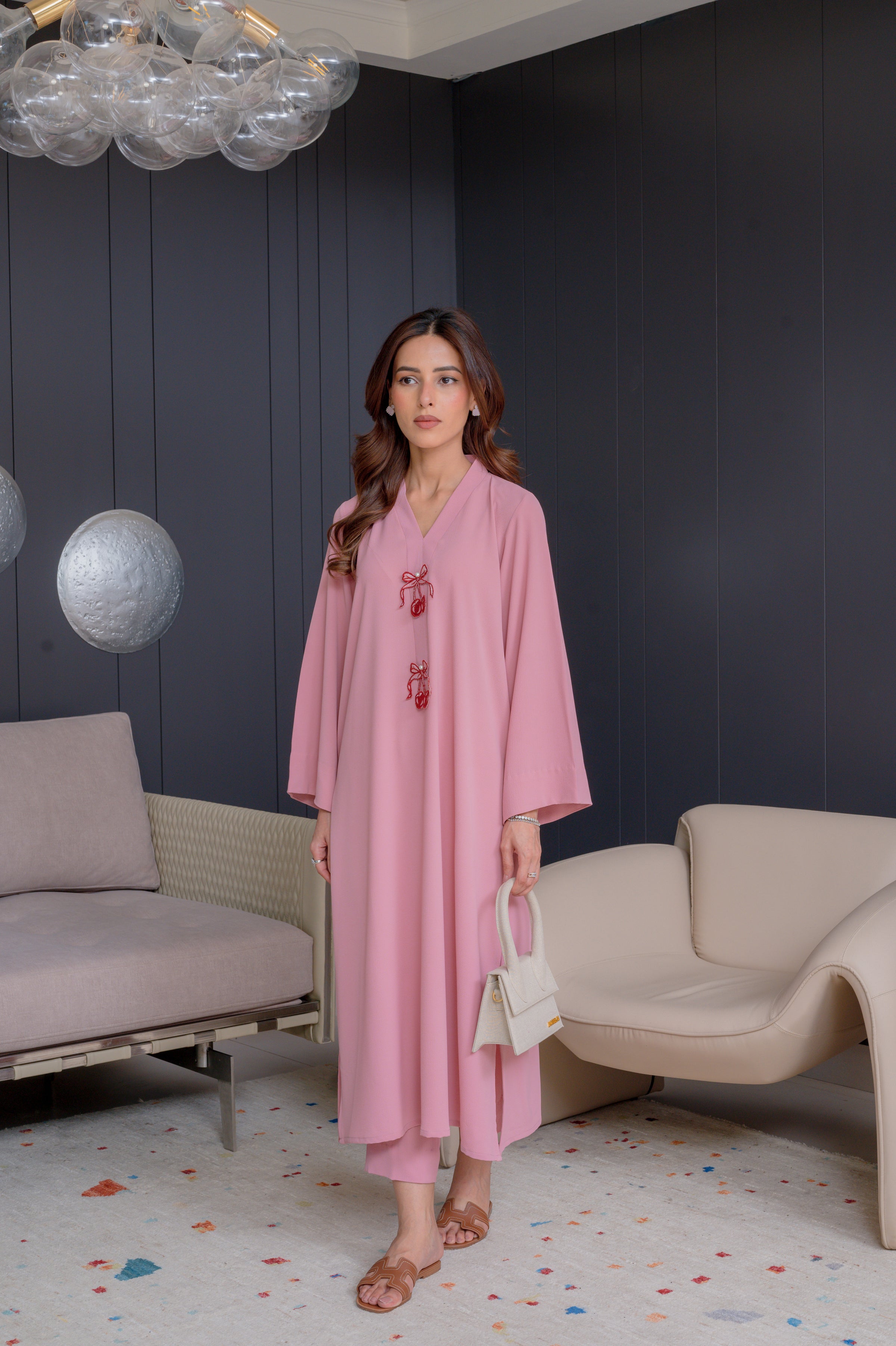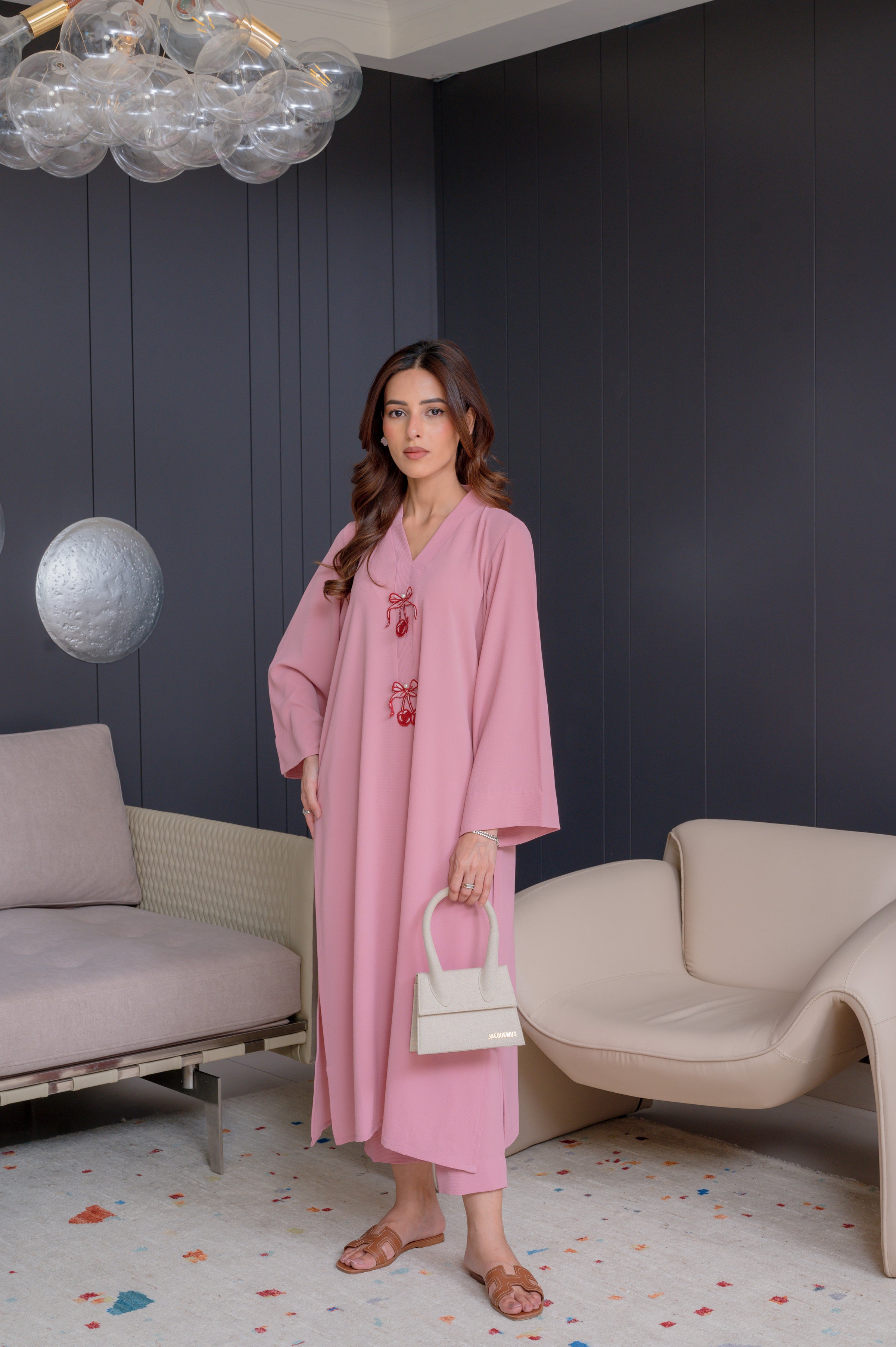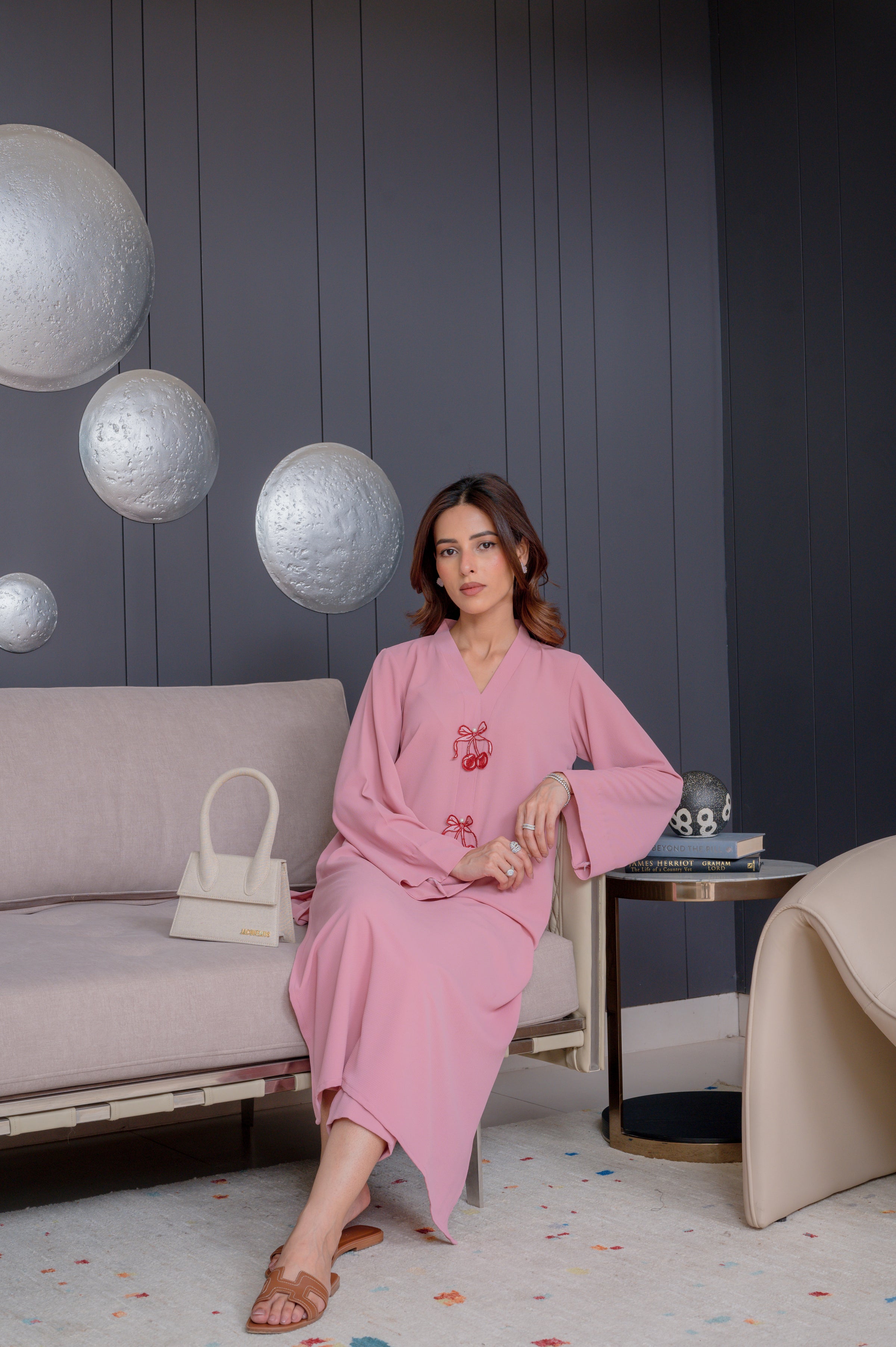 Blush Chérie radiates charm in a pink hue, brought to life with playful cherry embroidery and delicate hanging embellishments that add movement and flair. The thoughtful detailing on the ensemble creates a graceful balance of elegance and whimsy, making it a standout piece for both casual sophistication and festive occasions. Designed with a timeless silhouette, this suit seamlessly combines artistry with wearability.