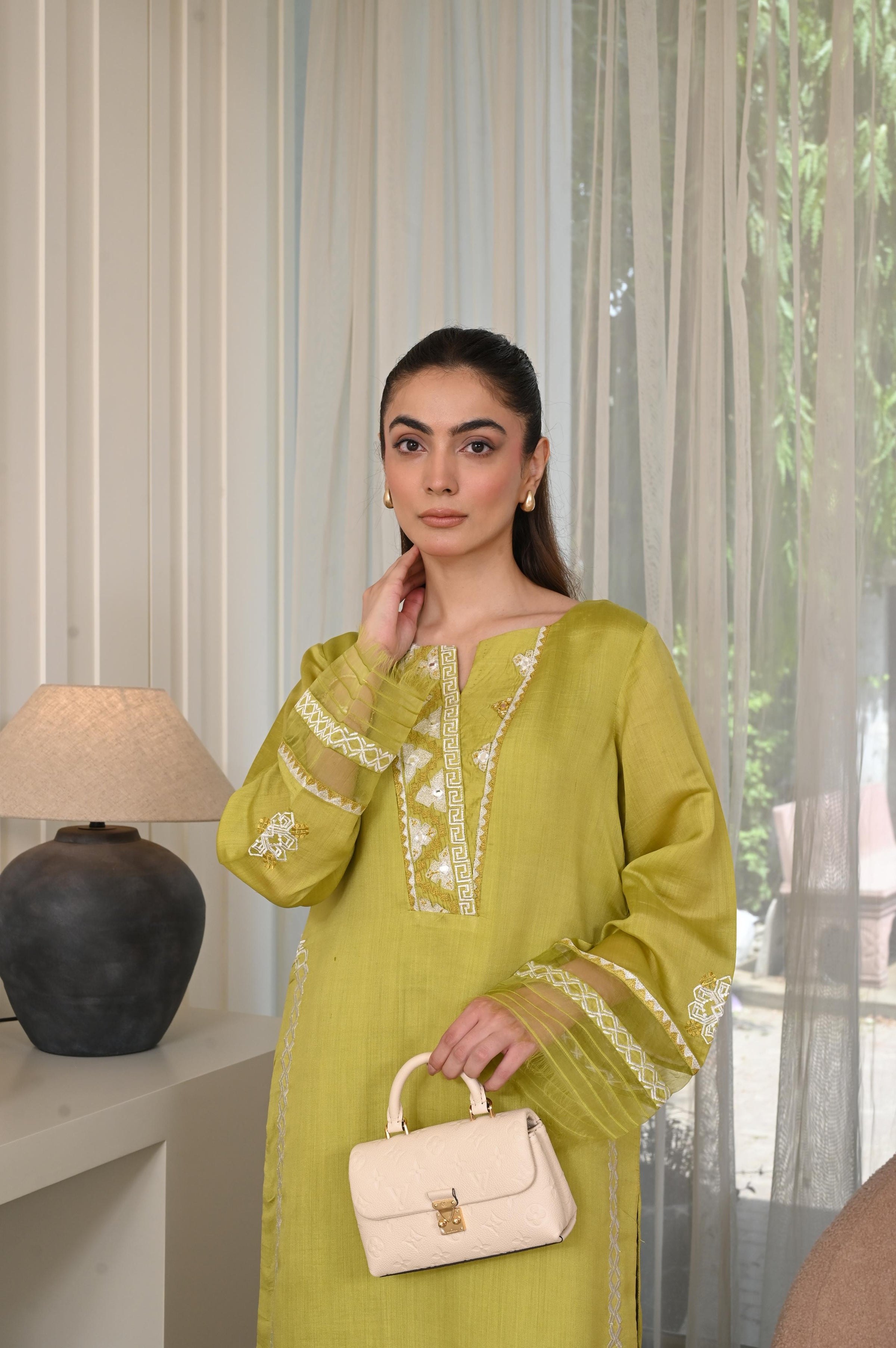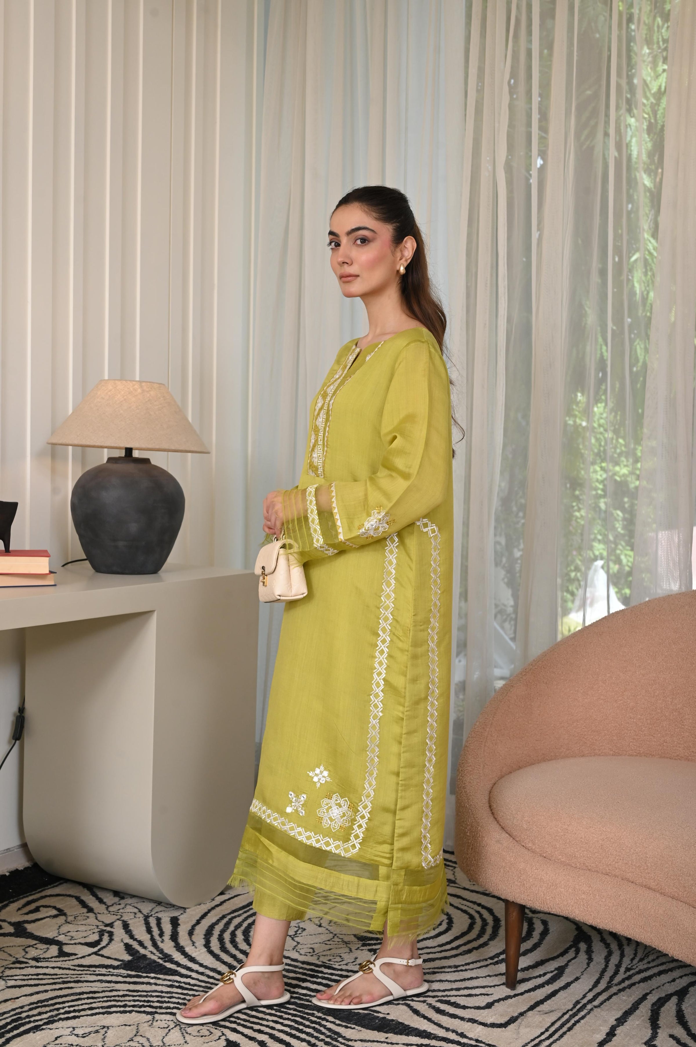This two-piece set is adorned with intricate embroidery, sheesha work, and delicate organza embellishments—crafted for timeless formal elegance.