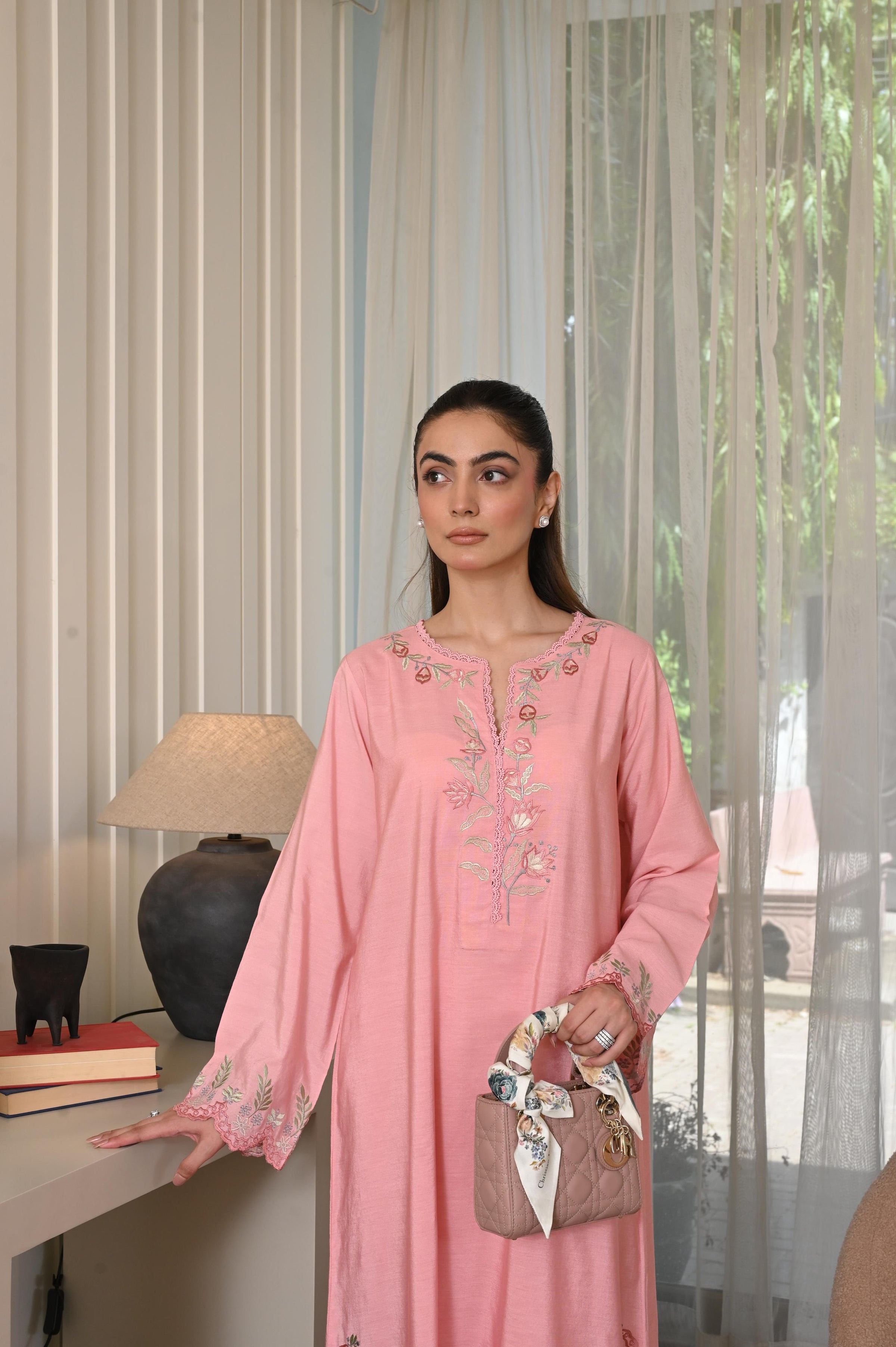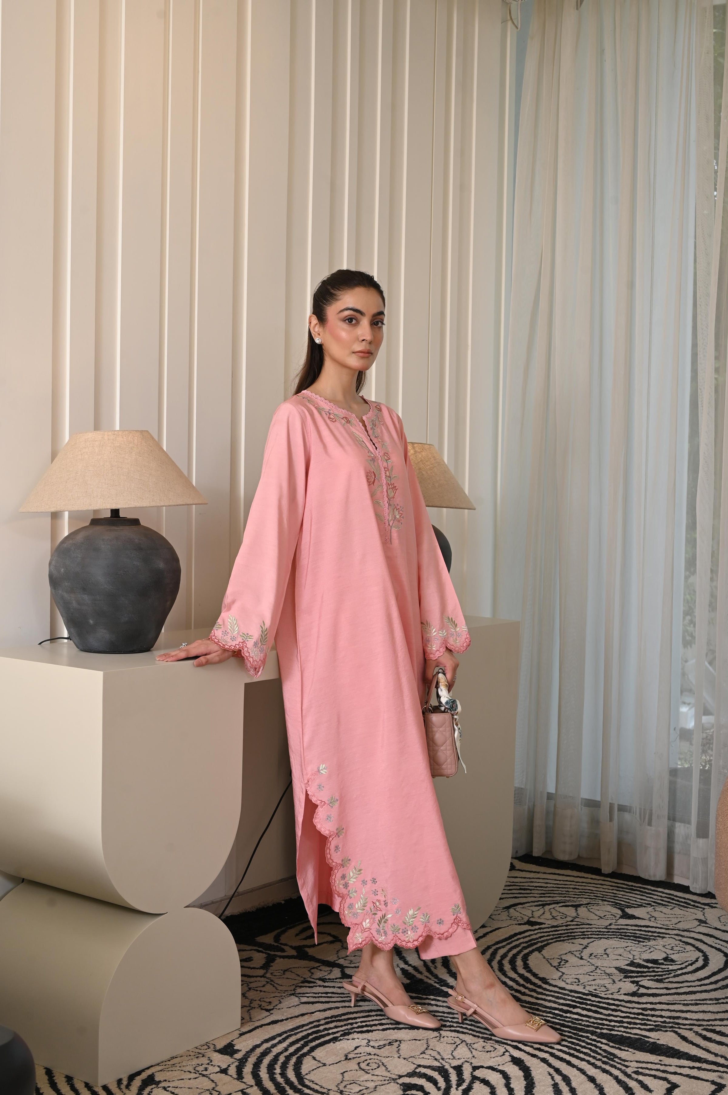 Gracefully tailored in soft pink, this two-piece set features delicate pastel embroidery—perfect for festive occasions or effortless everyday elegance.