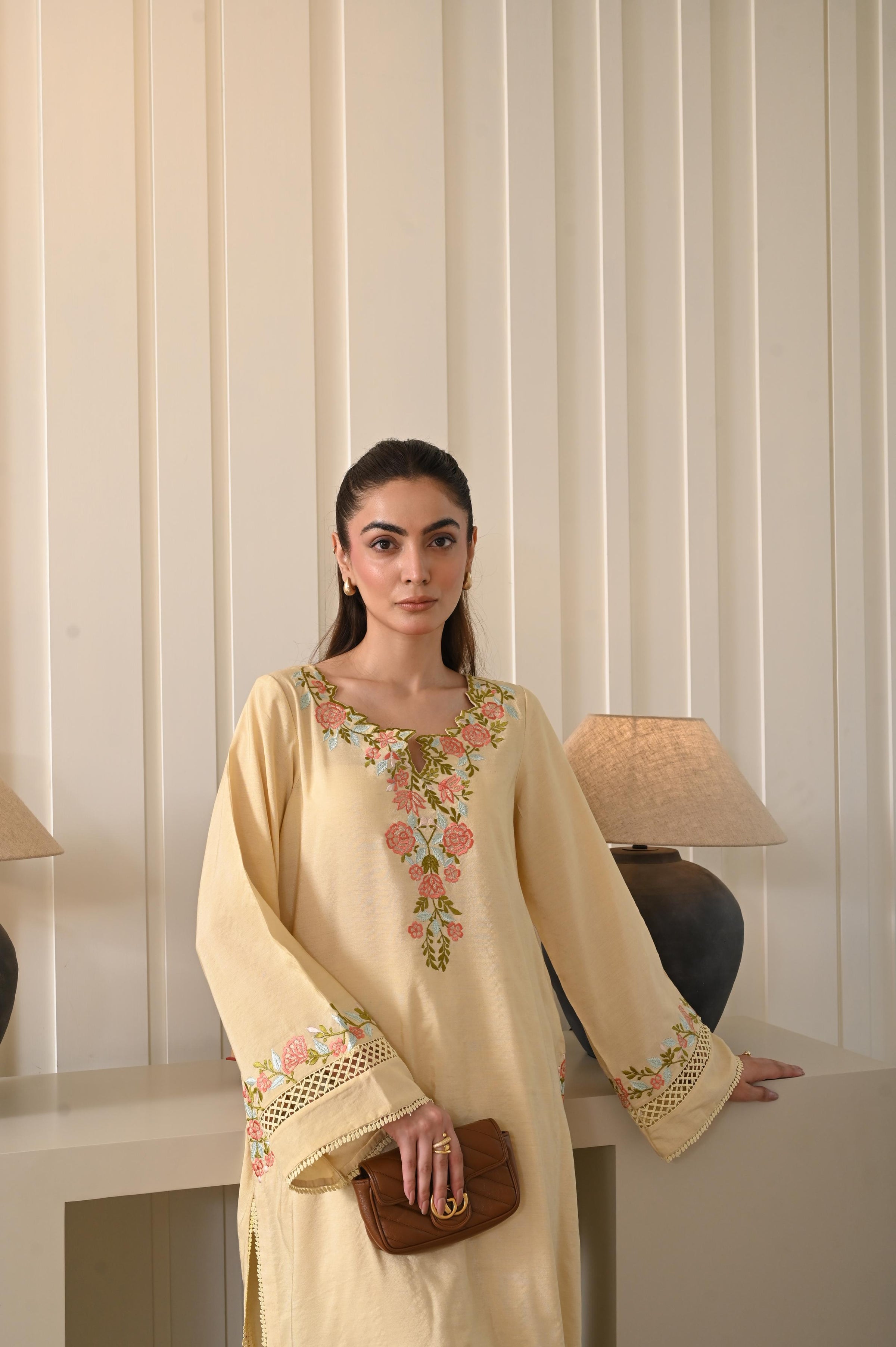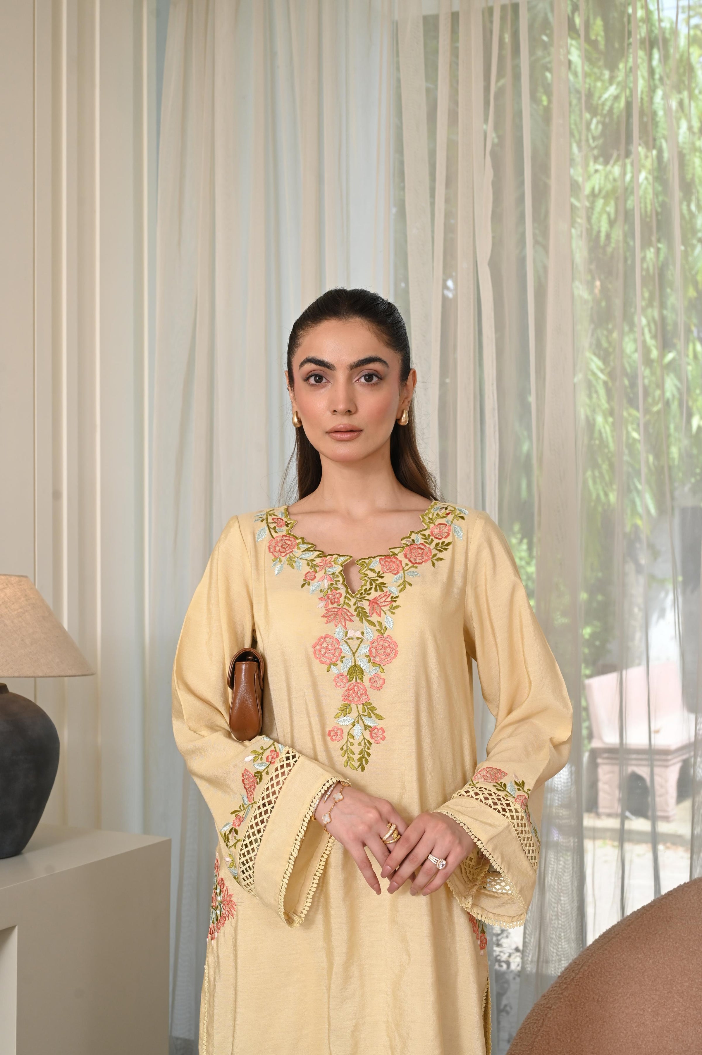 Sunlit in soft yellow, this two-piece set is adorned with delicate floral embroidery—bringing charm to both celebrations and everyday moments.