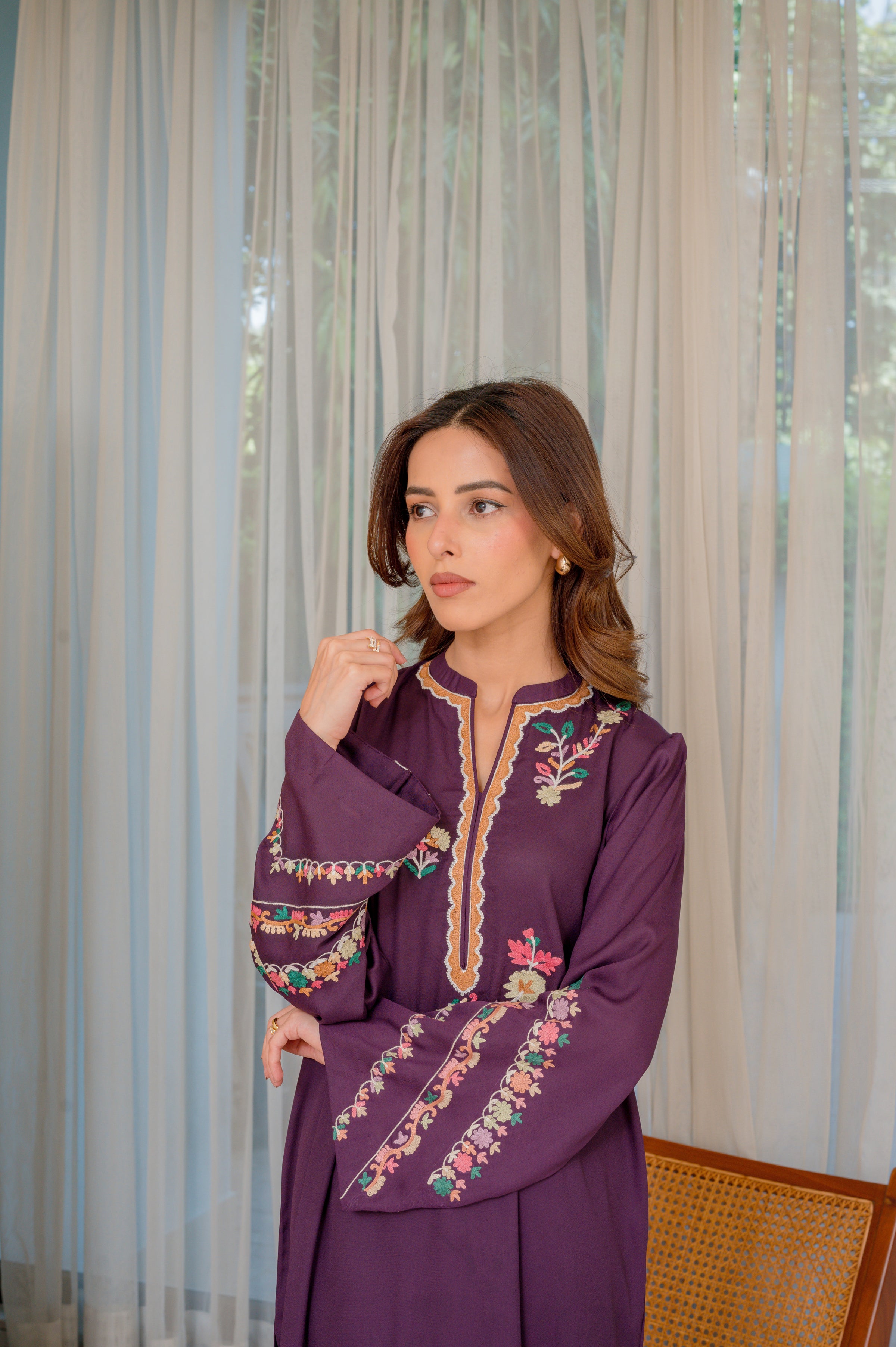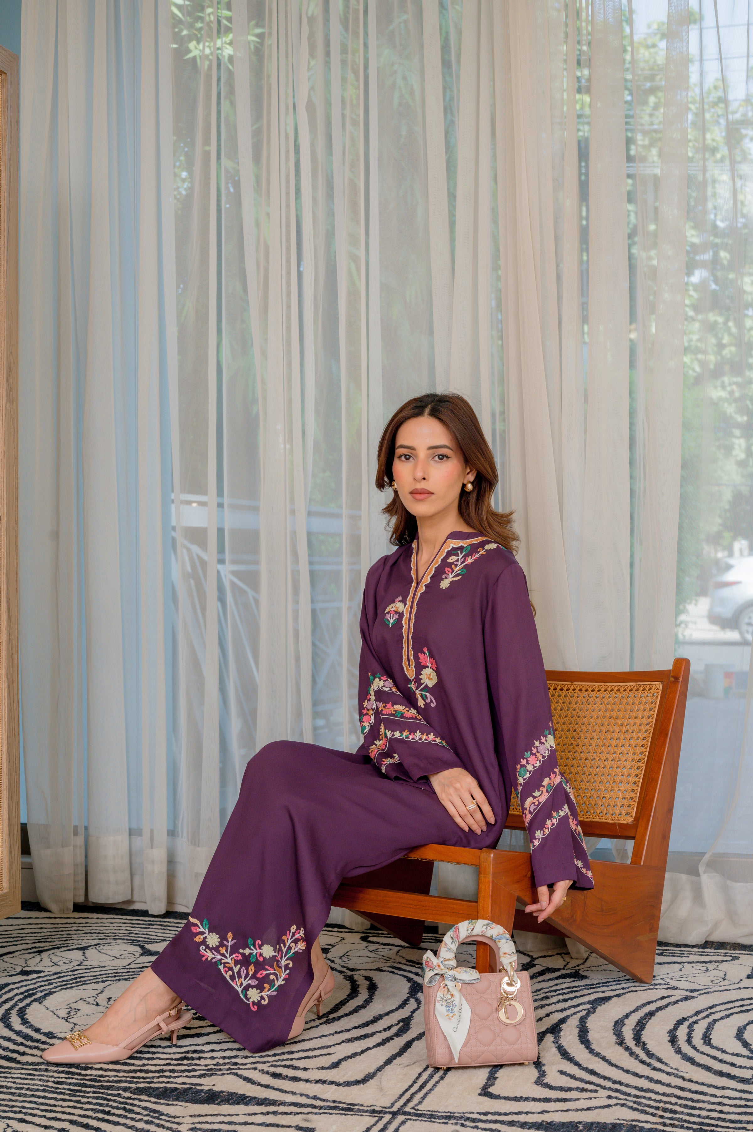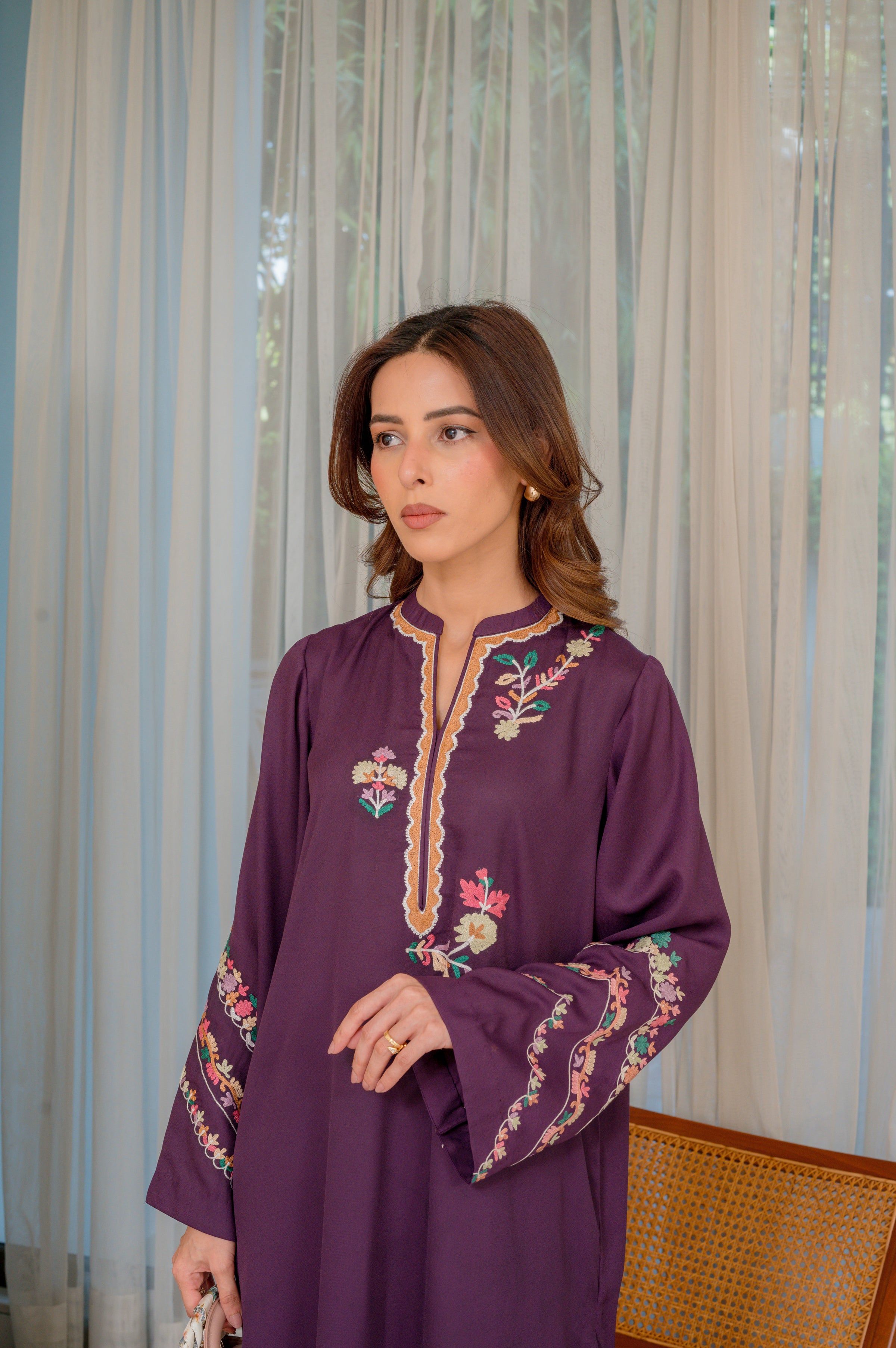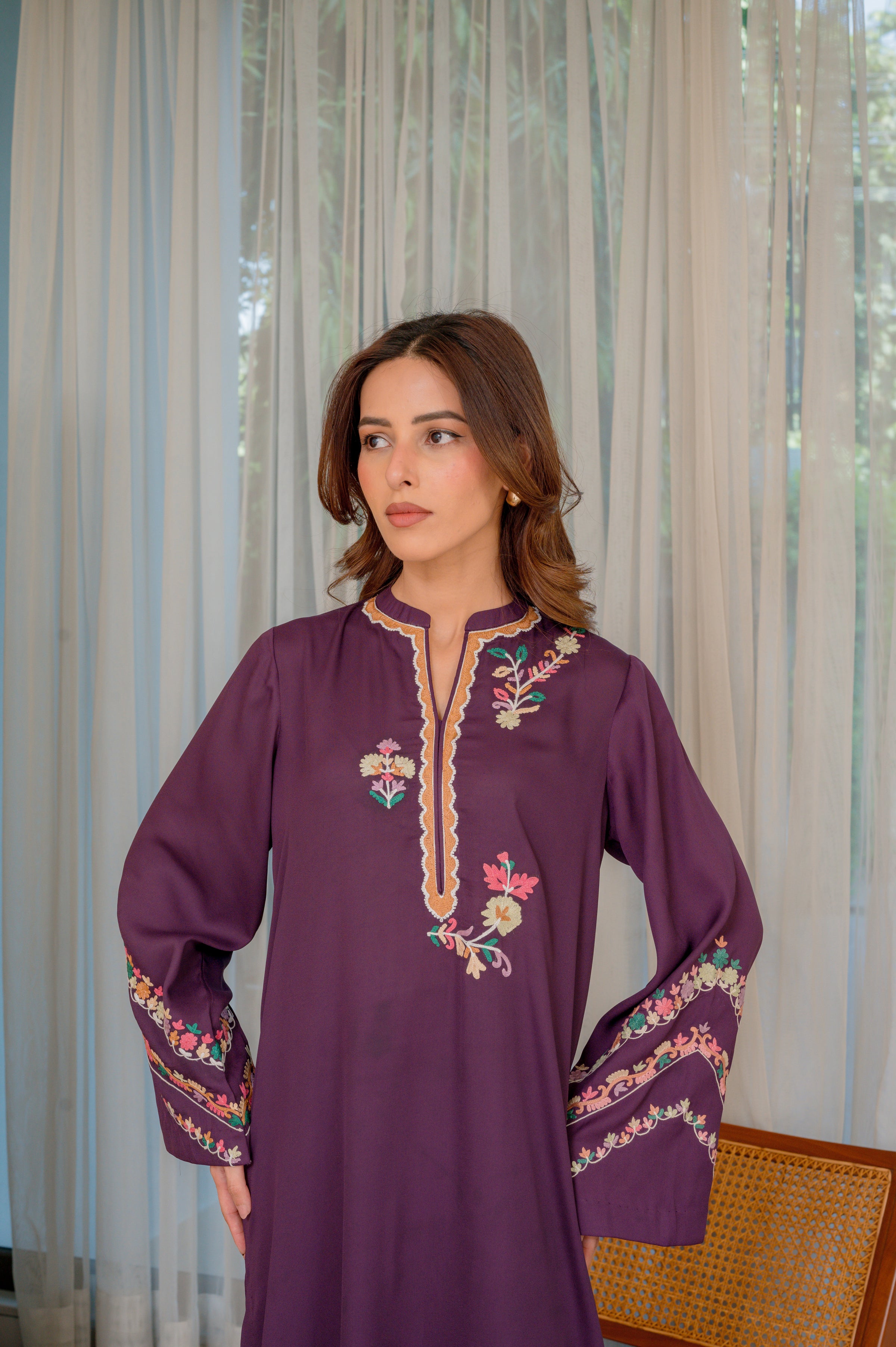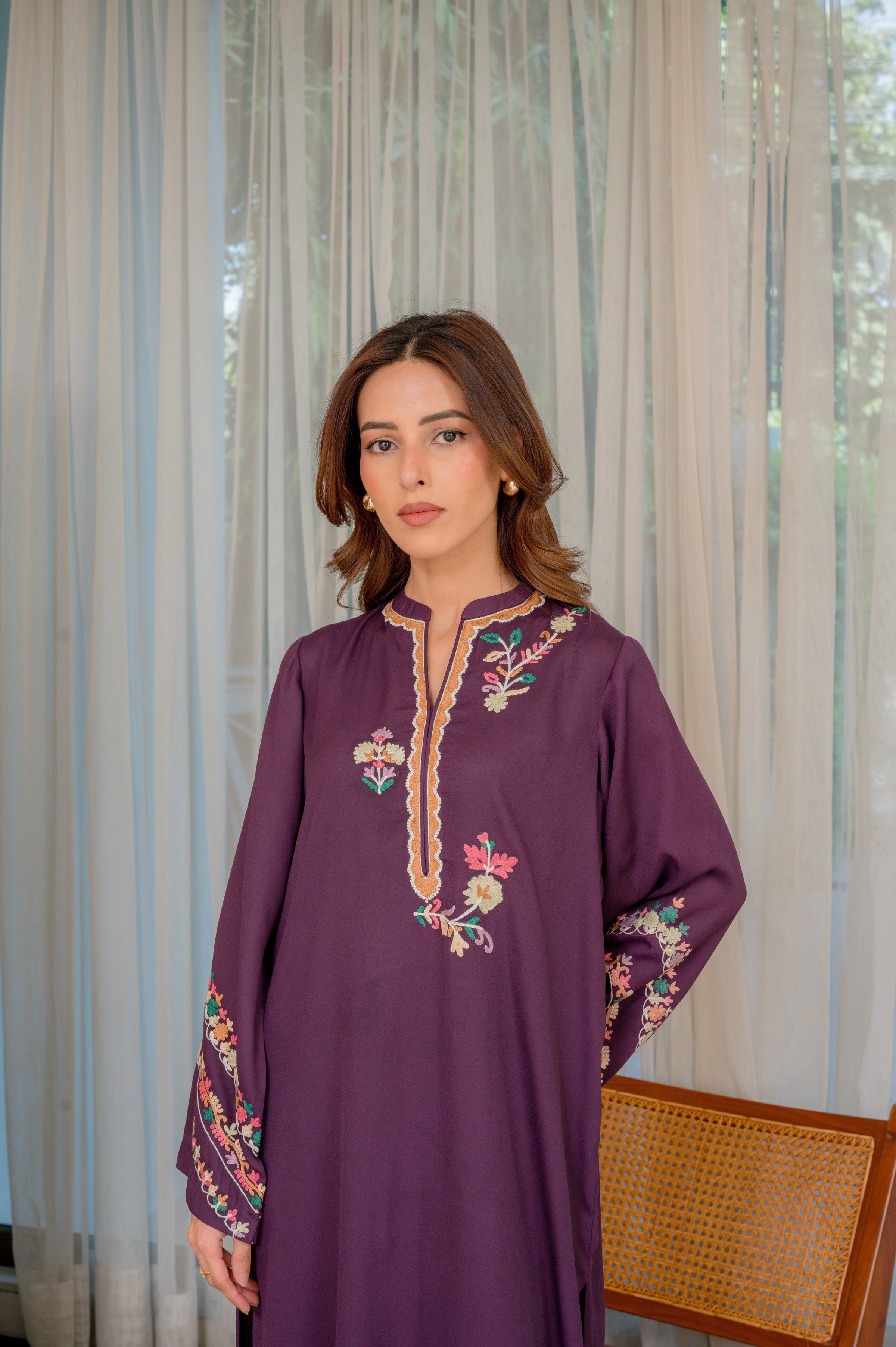 Amethyst celebrates classic aari work on a rich plum canvas. Delicate florals trace the split neckline and scalloped placket, cascade in layered bands along the wide sleeves, and bloom at the hem corners for balanced artistry. Cut in a relaxed, long silhouette with soft drape and side slits, it blends timeless craft with modern ease—perfect for festive lunches, soirees, and elevated everyday wear.