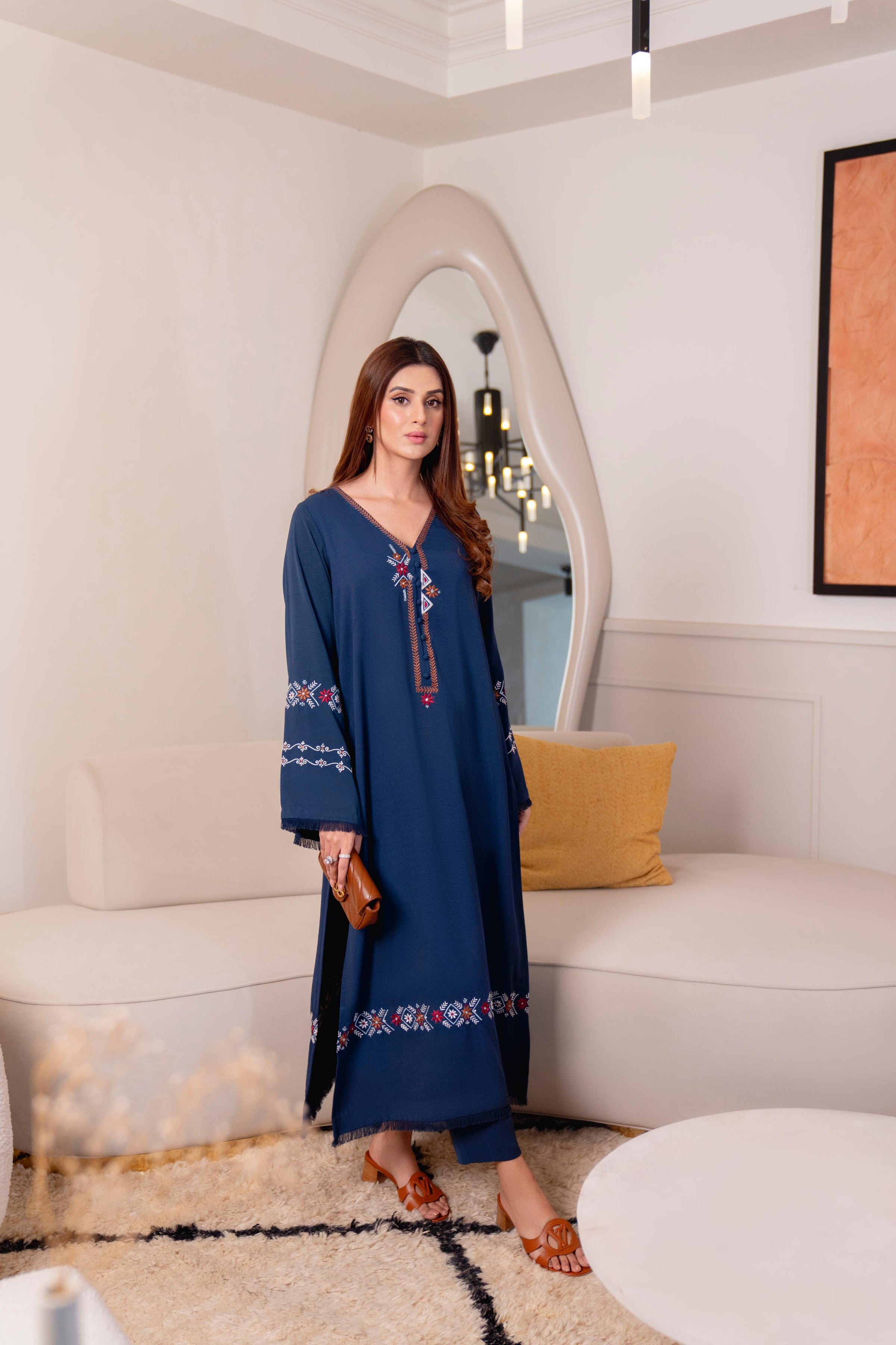 Nyra is crafted from dark blue fabric, featuring vibrant multi-colored embroidery. The intricate design combines white, brown, and red hues, each complementing the others to create a harmonious and striking contrast.
