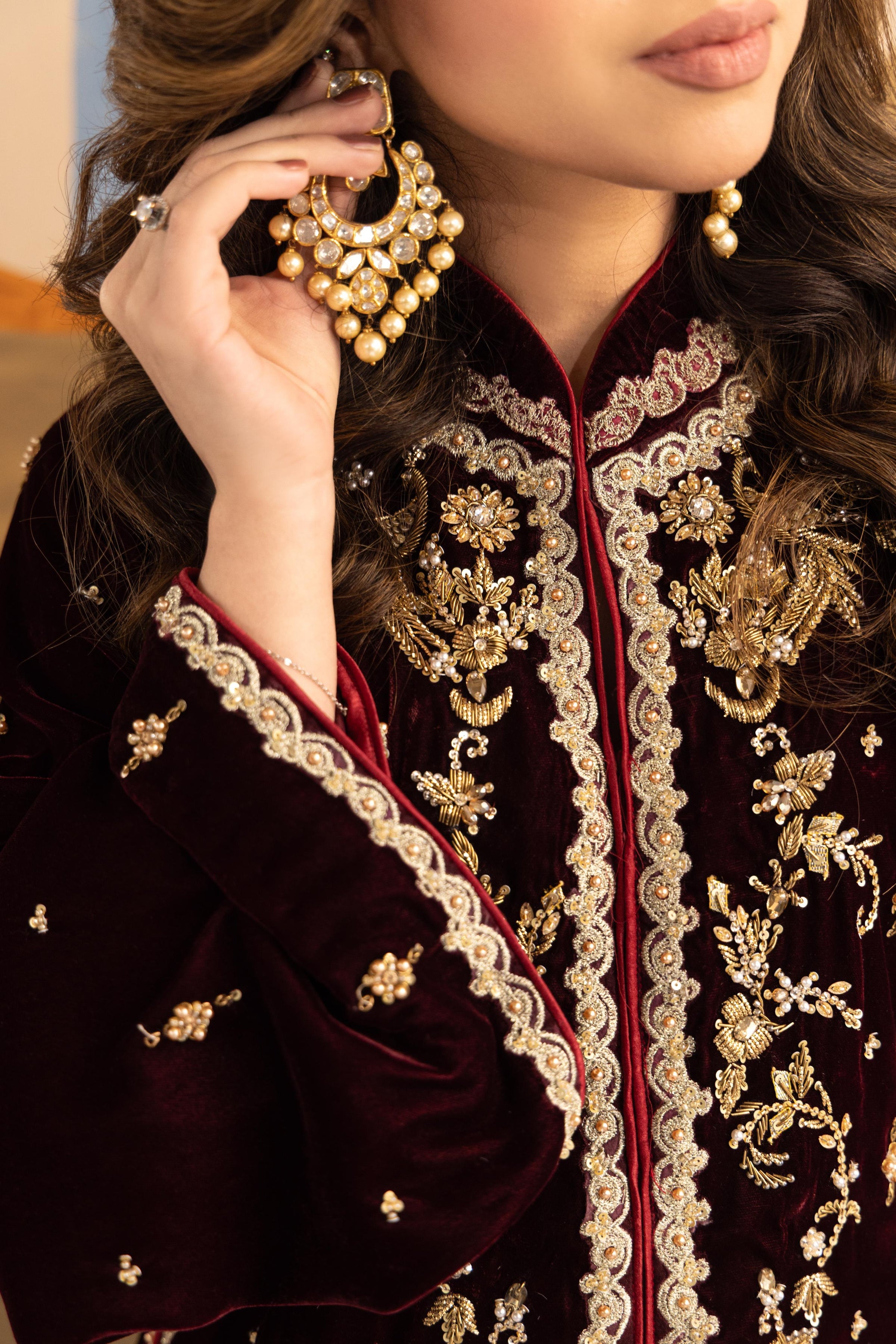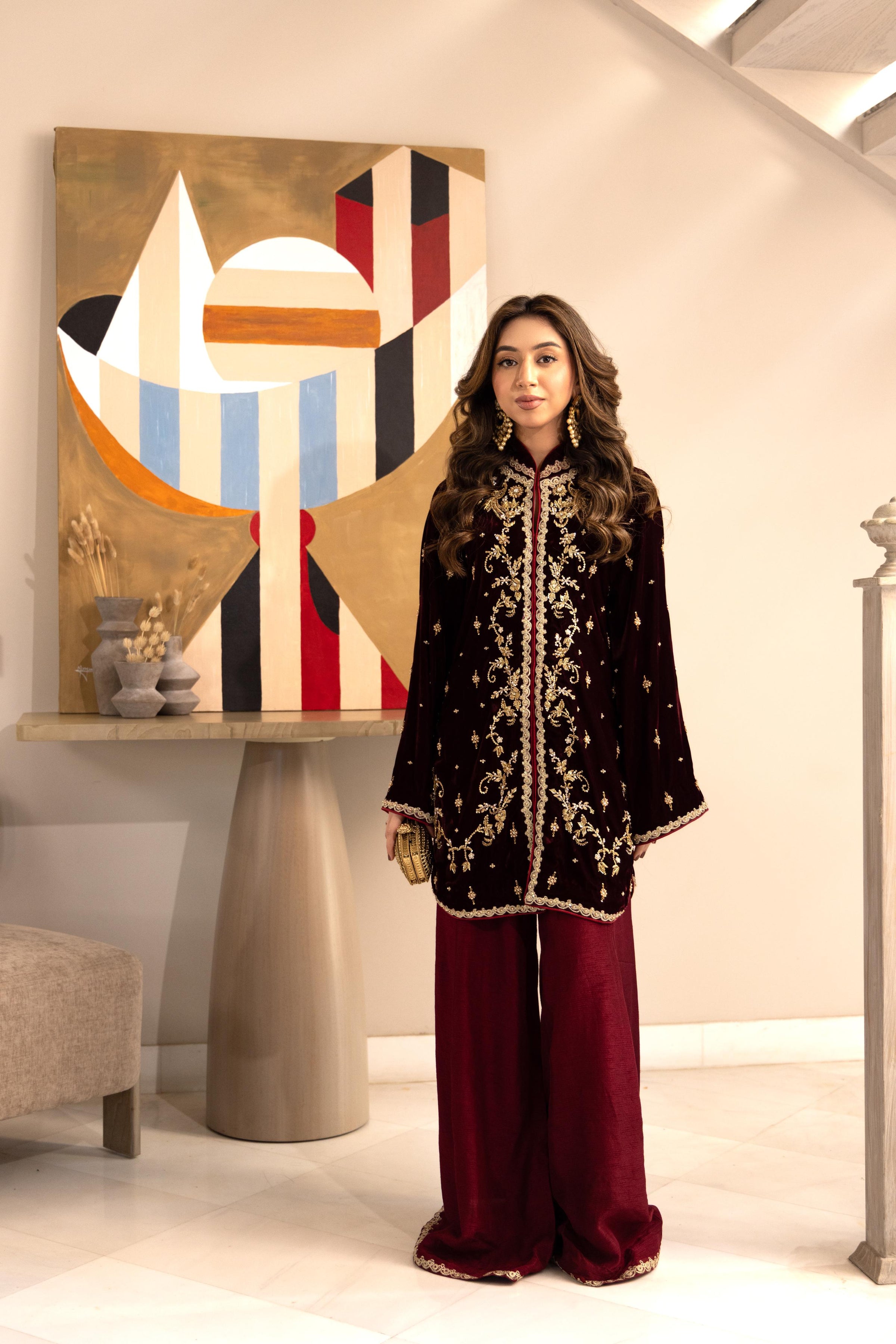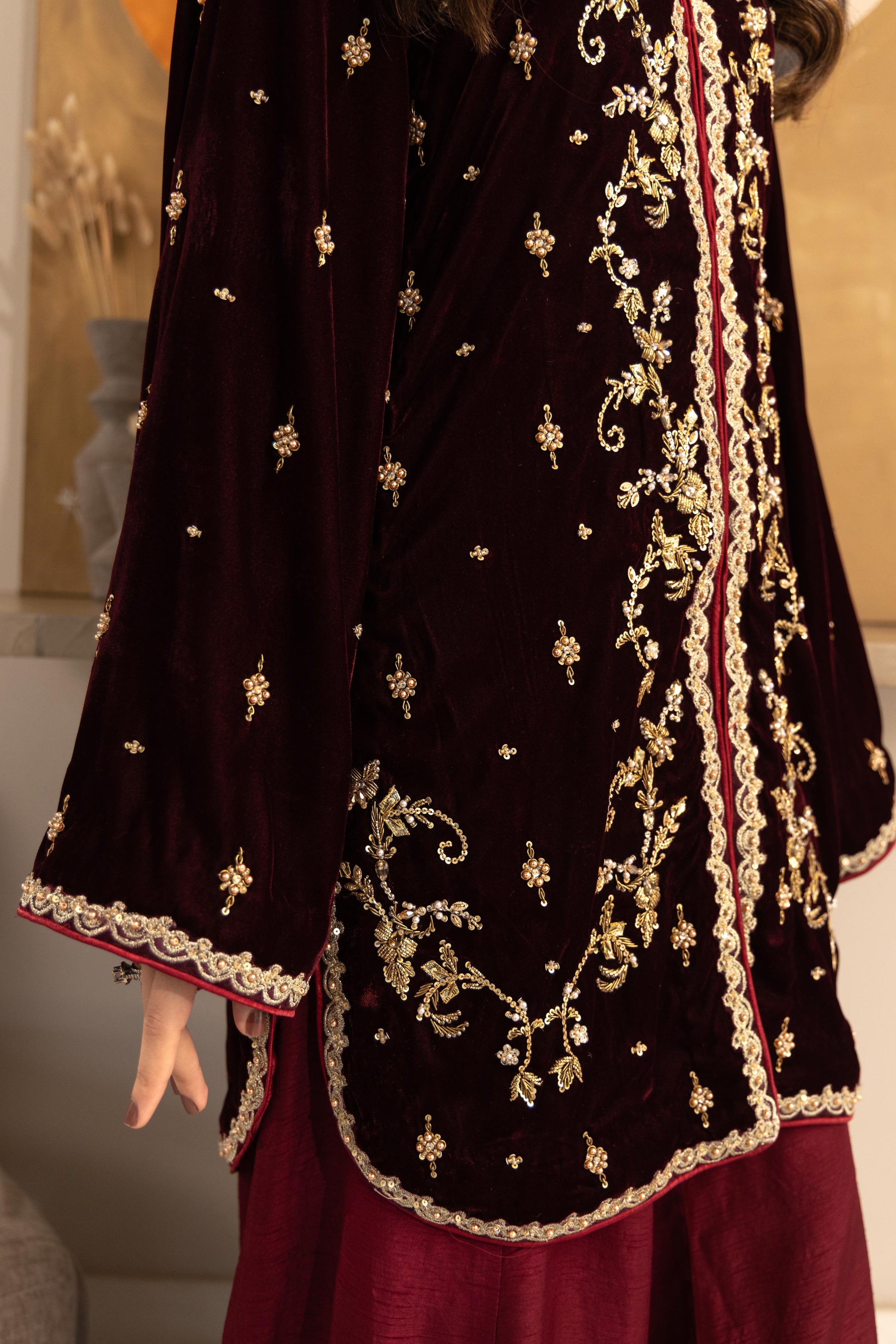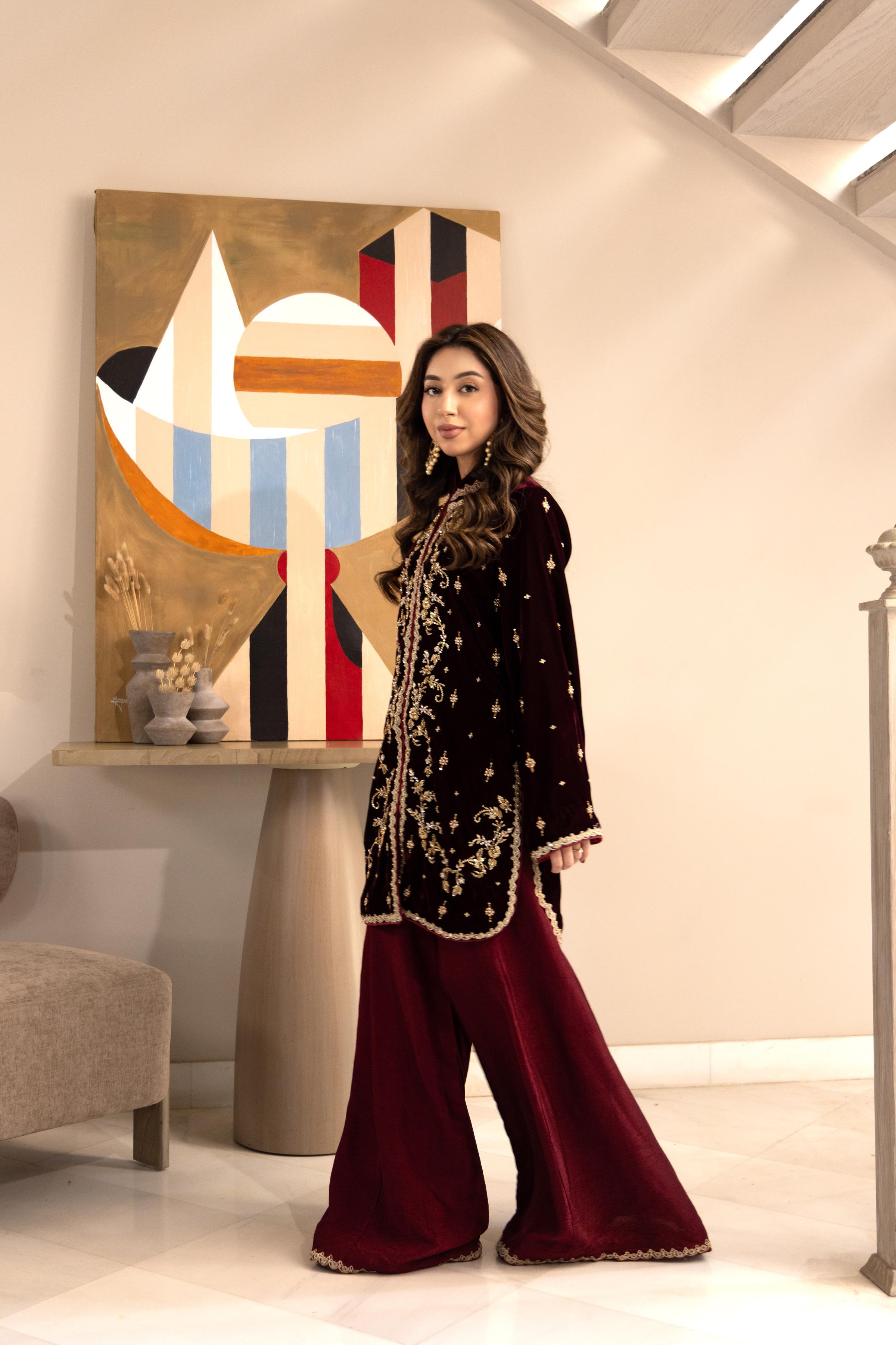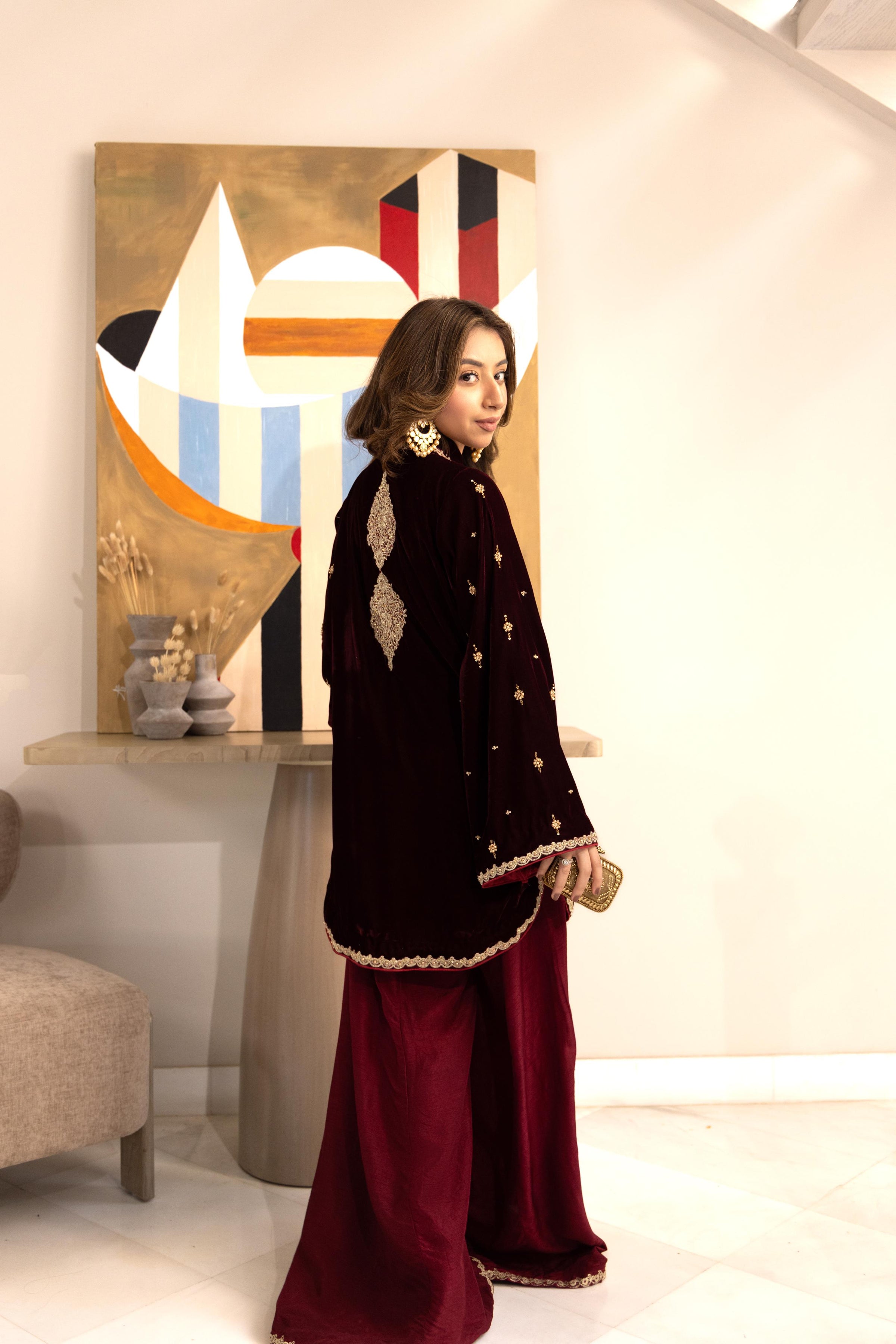 Maroon Éclat is a statement ensemble crafted in a deep, regal maroon hue, designed for evenings that call for elegance and presence. The short kurta is adorned with intricate gold hand work and tilla embroidery. Paired with flowing wide-leg trousers finished with subtle detailing at the hem, the look balances tradition with contemporary grace.