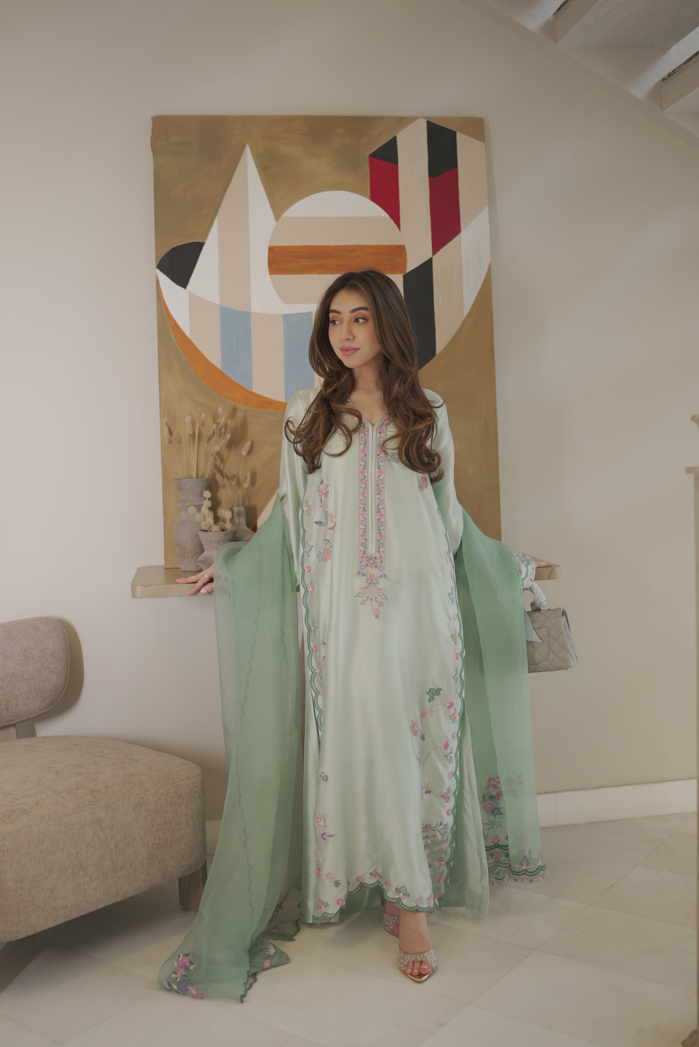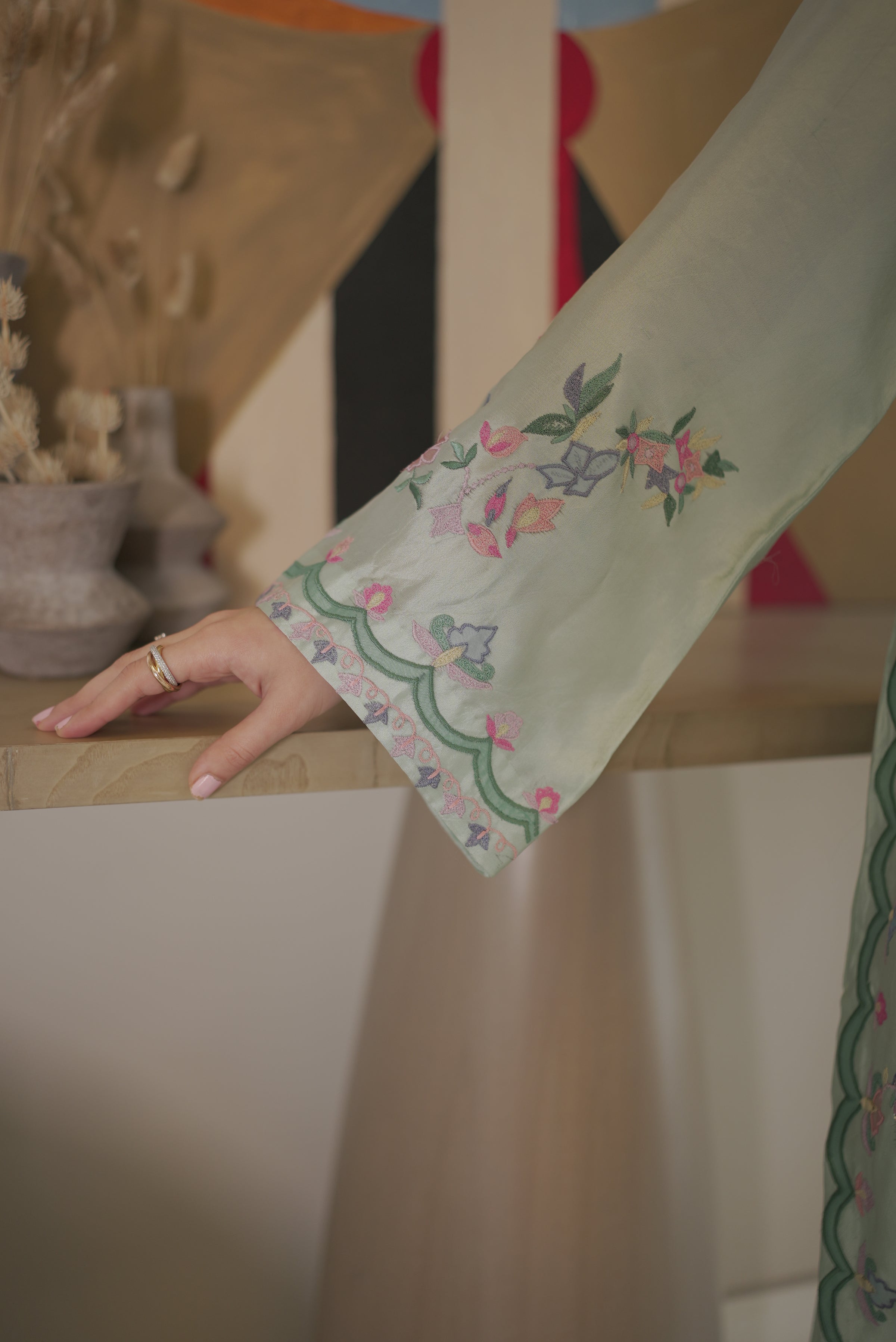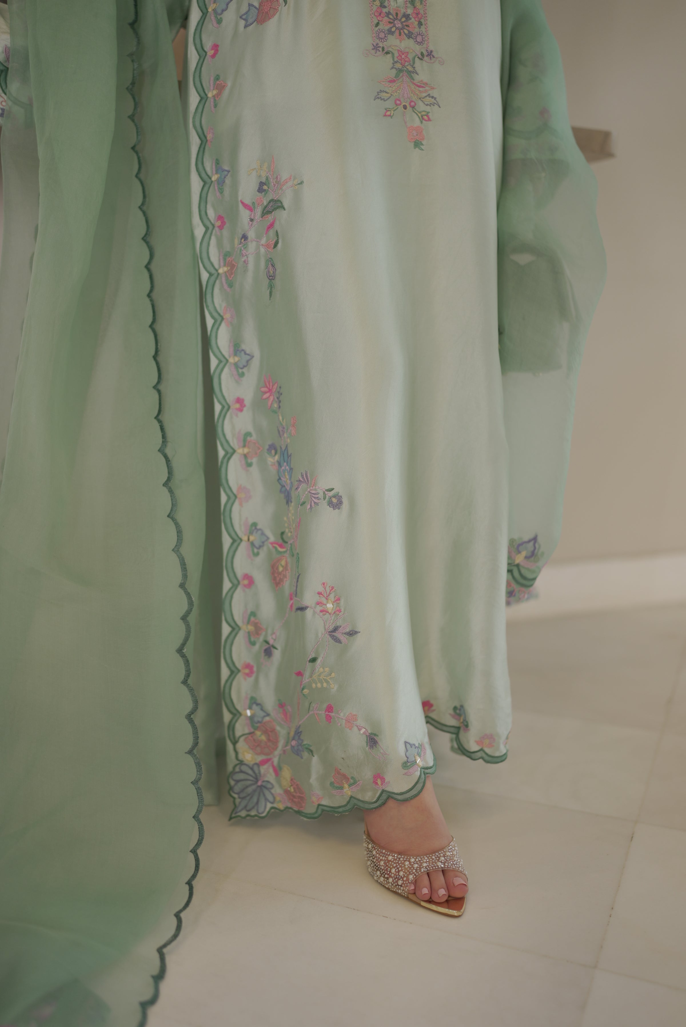 Cotton Candy – A luxurious silk ensemble, gracefully embellished with intricate embroidery and refined appliqué detailing.